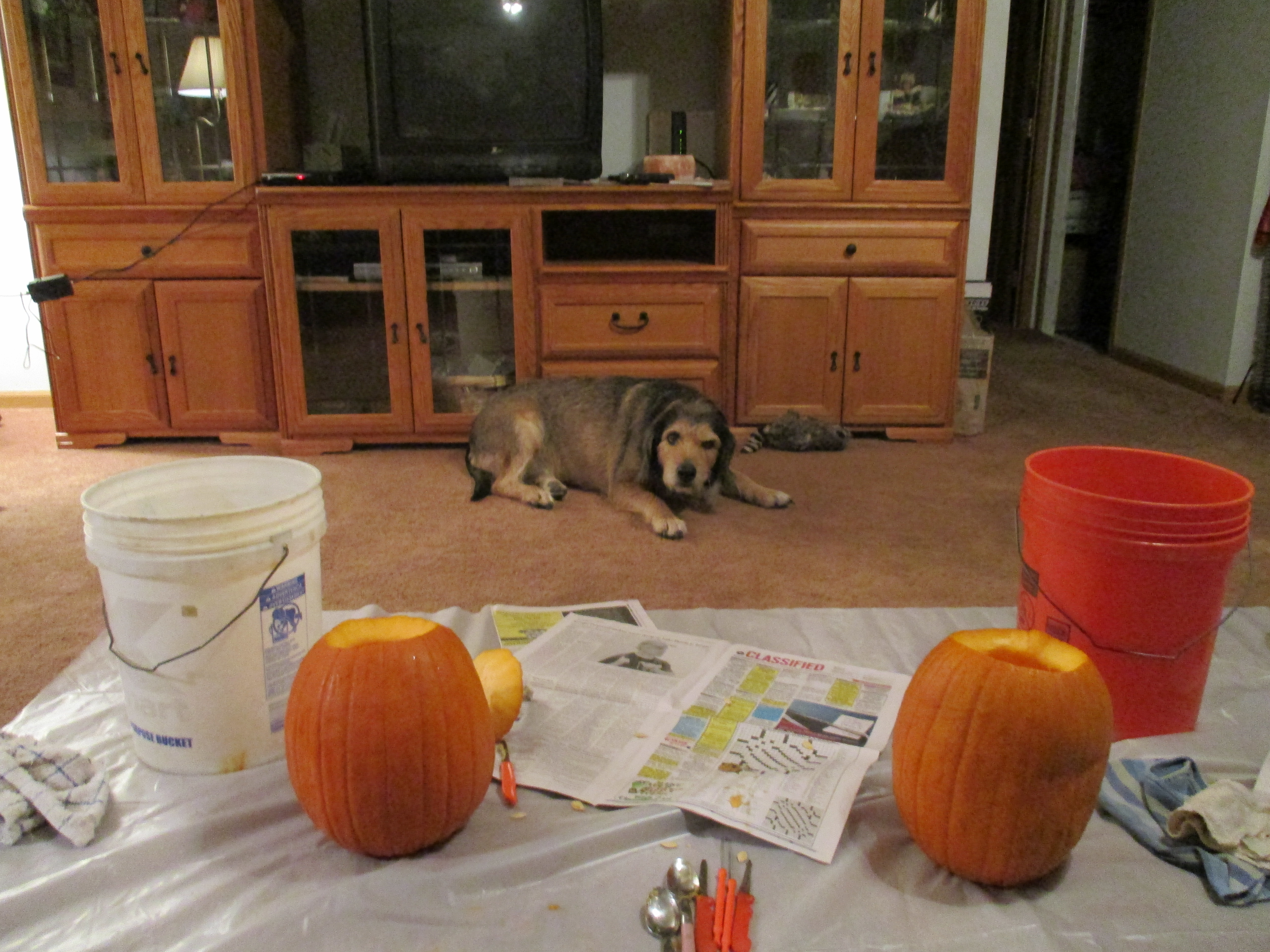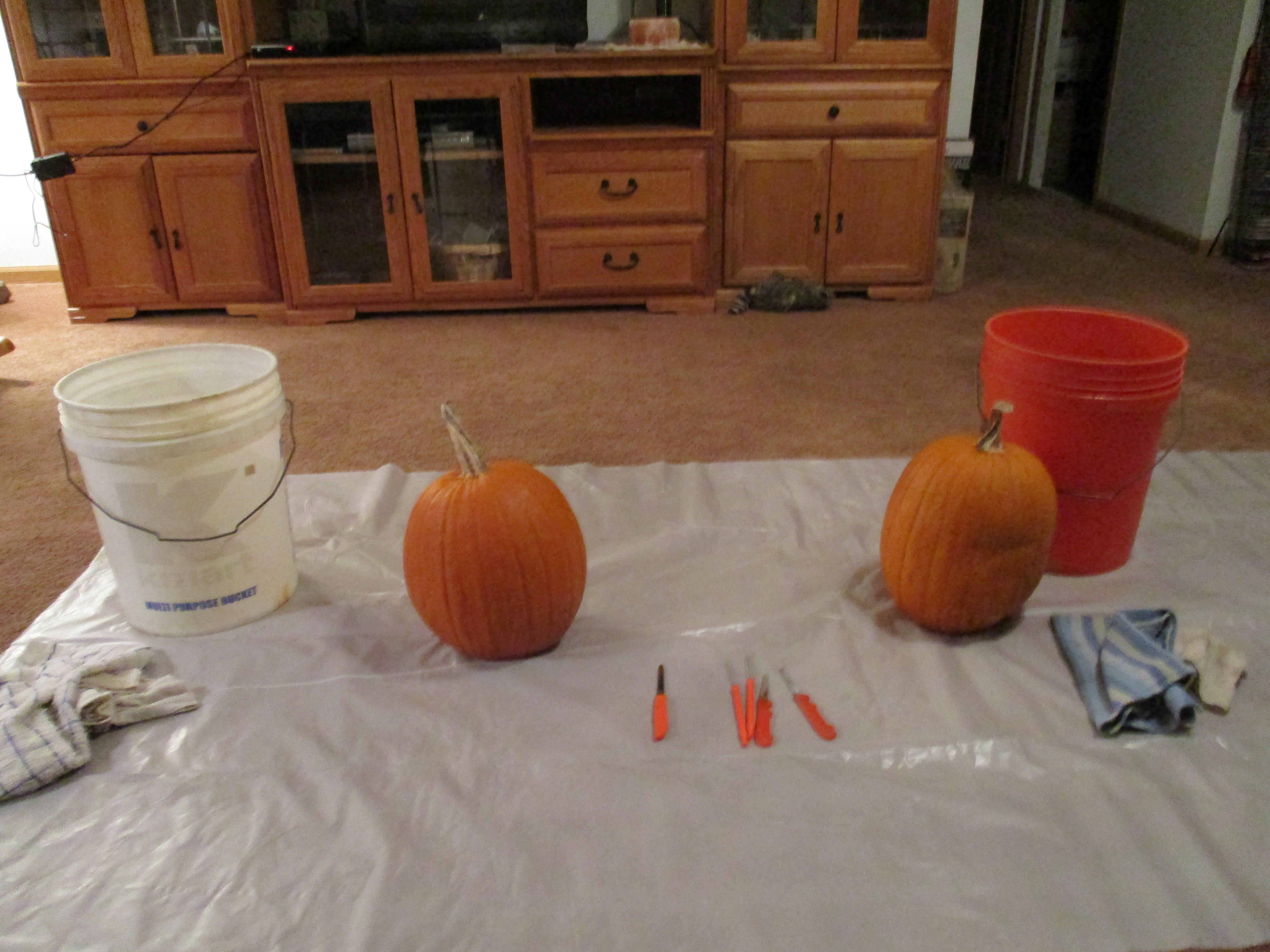 My husband set things up in the living room. Set up also included a fire burning in the fireplace, a Carpenters CD playing, and he with a whisky and water and me with a limon’ and coke. I do believe this is the first time we ever carved pumpkins in the living room – my how things change when the kids are grown.