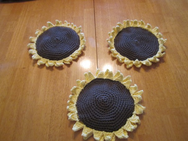 I made some sunflower pot holders that I gave to my daughters for Easter. I think they look better in real life than they do in the picture. I think I will be making some more of these since I did not keep any for myself.
