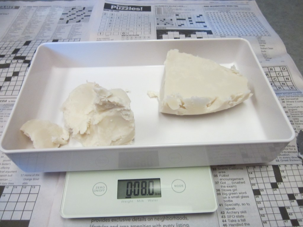 Wednesday, Nov 3 – I made soap. I wanted to use some of the tallow that I just rendered. The recipe I made was an oil combination of 40% coconut oil, 40% tallow and 20% olive oil. This is the first time I used this particular combination so I’ll try to remember to report how it turns out. It will be about 6 weeks before it is ready. I also added aloe to this batch.
