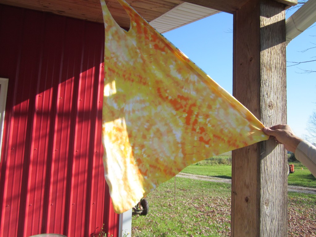 The capes are reversible so the other side of Addy’s was made with this brilliant yellow, orange and white tie-dye fabric.