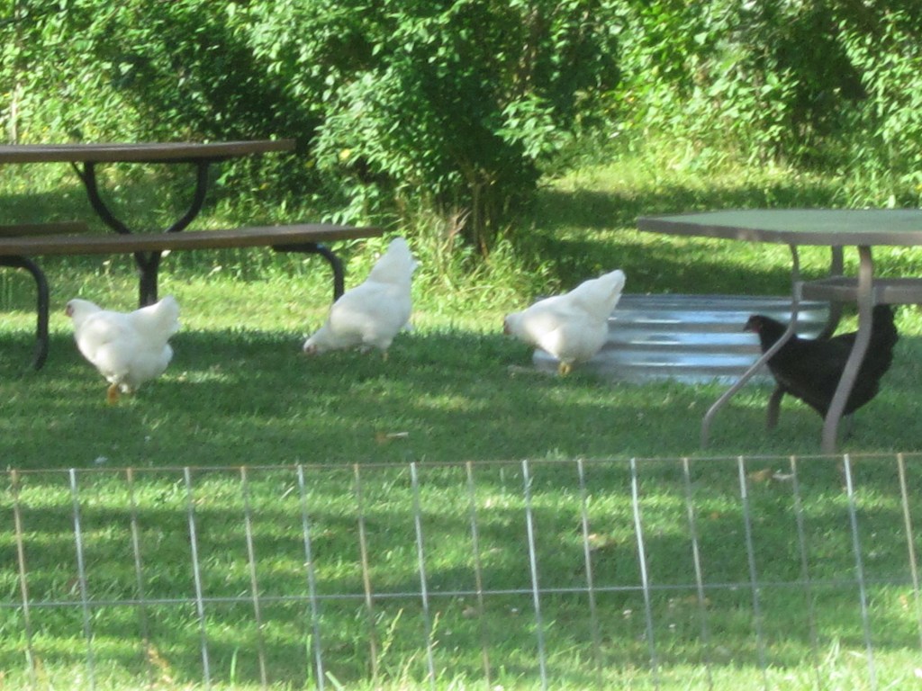 These chickens are some of the chicks we bought this spring. Out of the 12 chicks we started with this spring we still have six of them – two black and four white. It’s too early to tell, but we suspect one of the white ones might be a rooster since it’s comb and wattles are far more developed than the rest of them. We expect the hens to start laying in August.