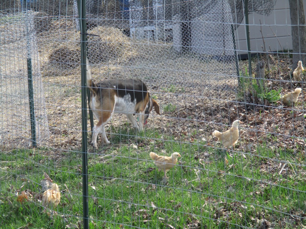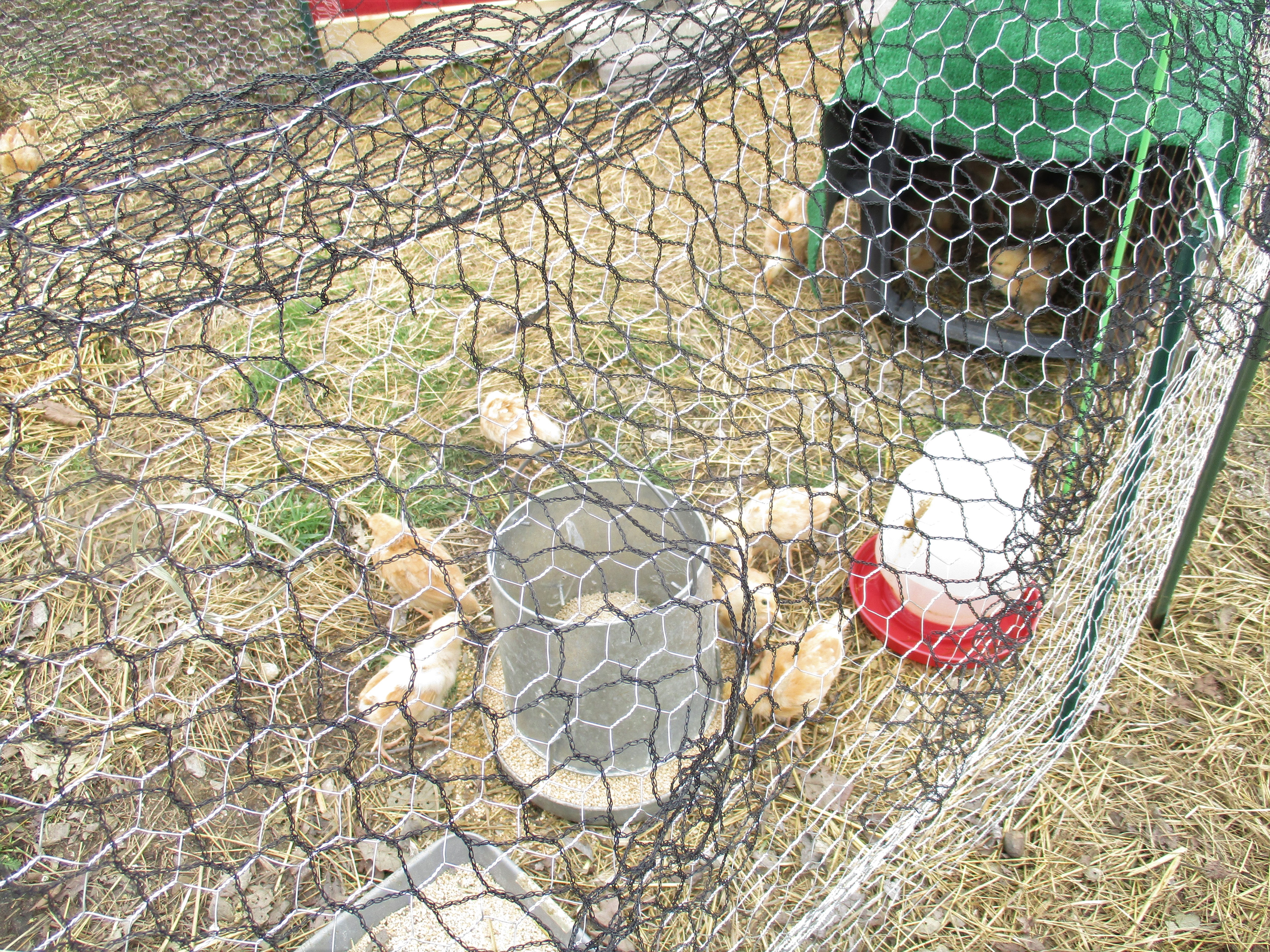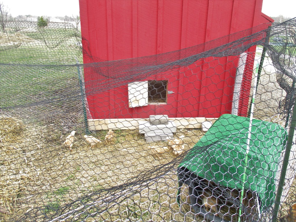 My husband set up their chicken wire enclosure. He designed it so they have access to the coop through the small door with hopes that they will learn to go in the coop at night.