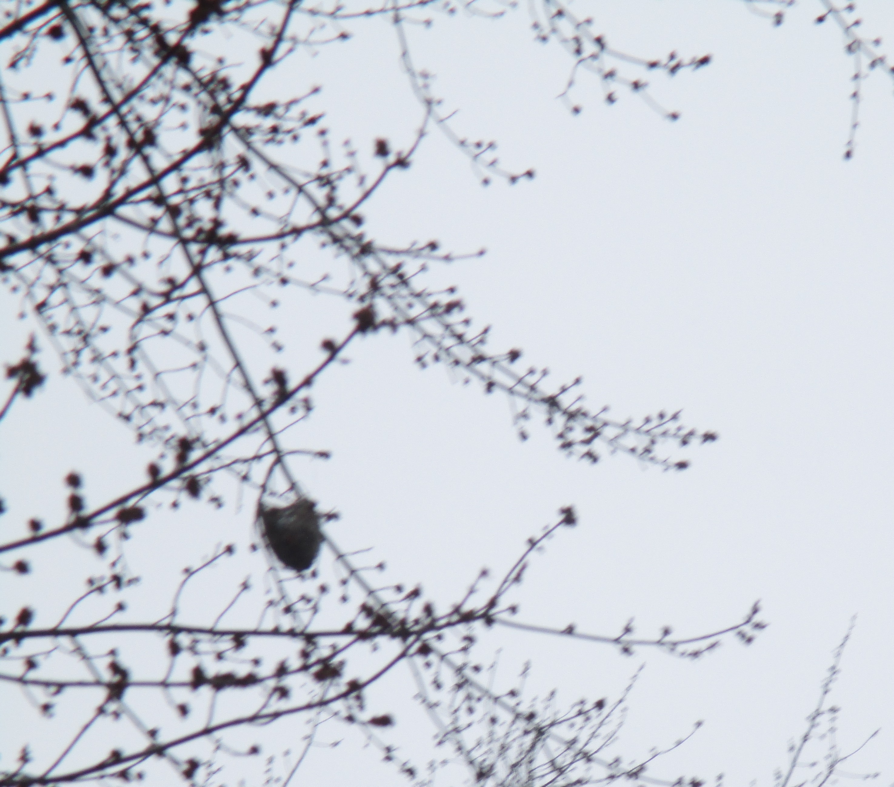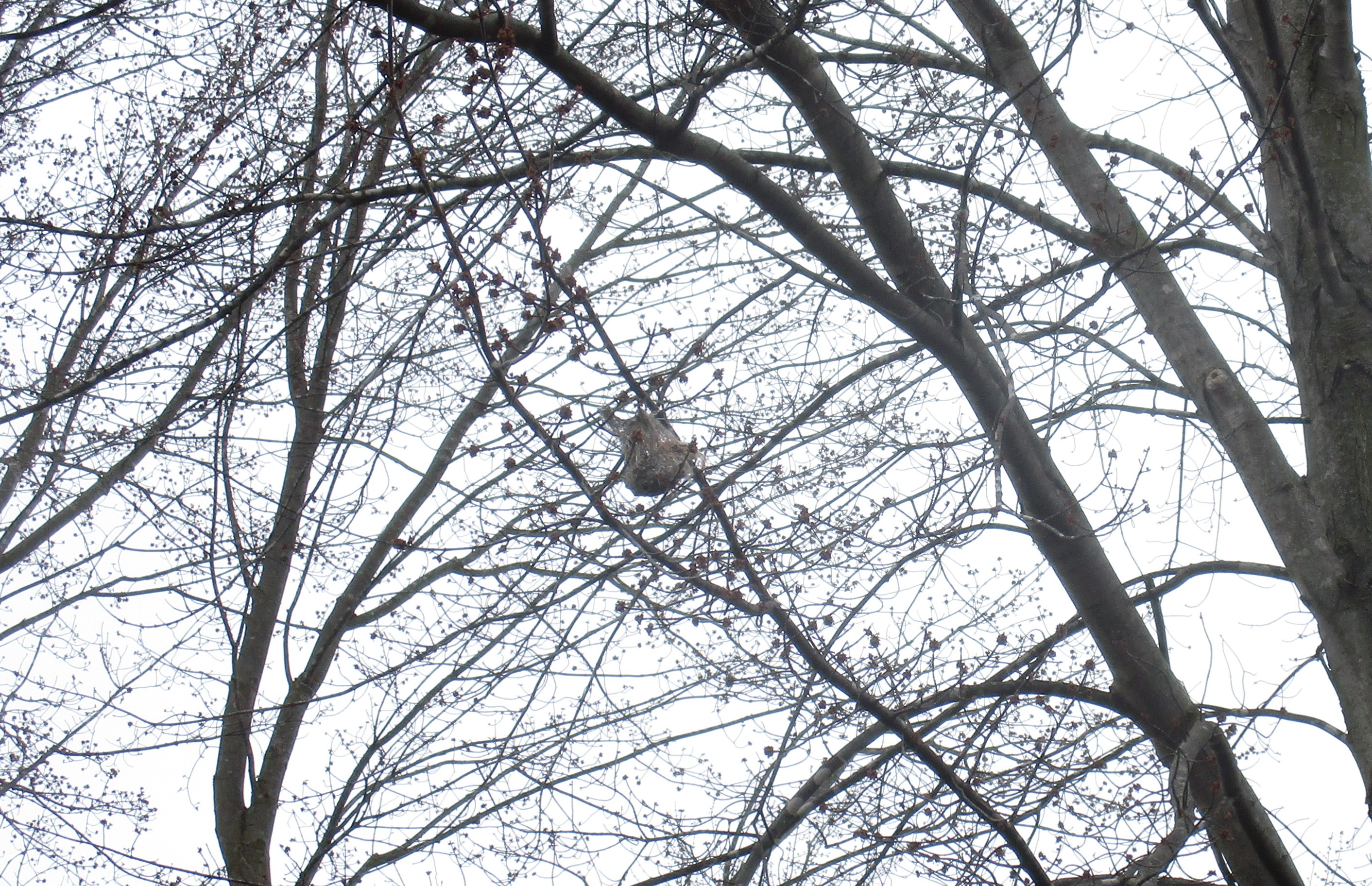 As I looked up to see if the maple trees were getting leaves yet I noticed what appears to be a Baltimore oriole nest. It seems too early to be a nest build this year, so I am assuming it was from last year or maybe even the year before.