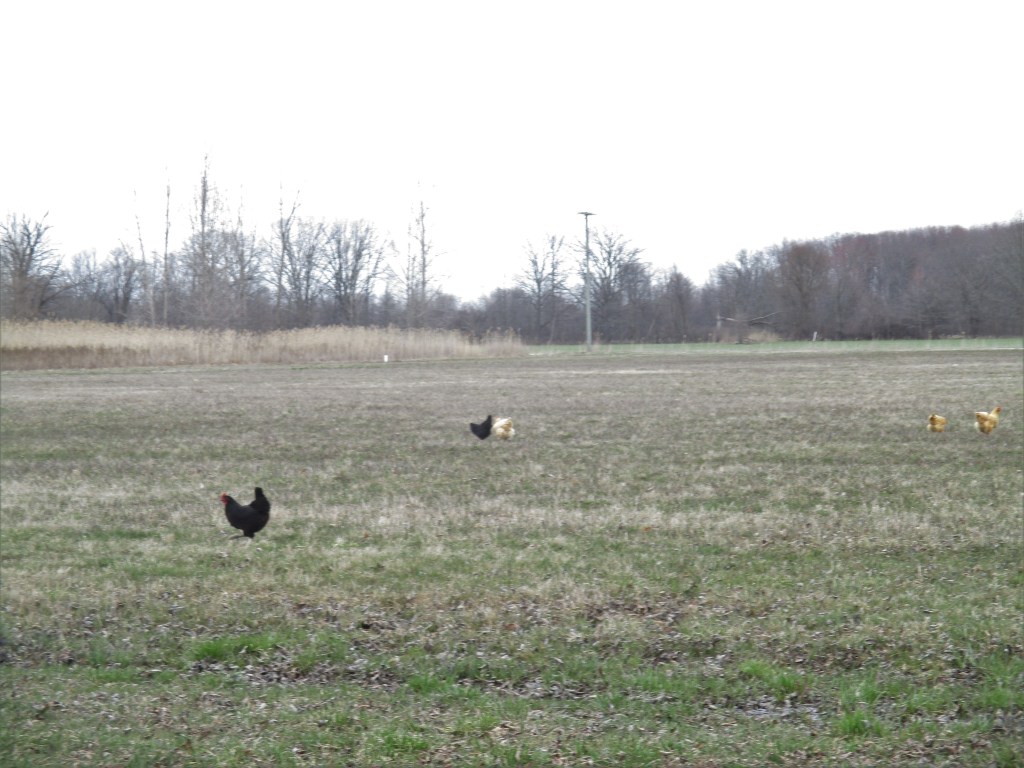 Some of the chickens had wandered into the field next door. This won’t be a problem once the fence is complete and it really isn’t a problem now because that neighbor doesn’t mind.
