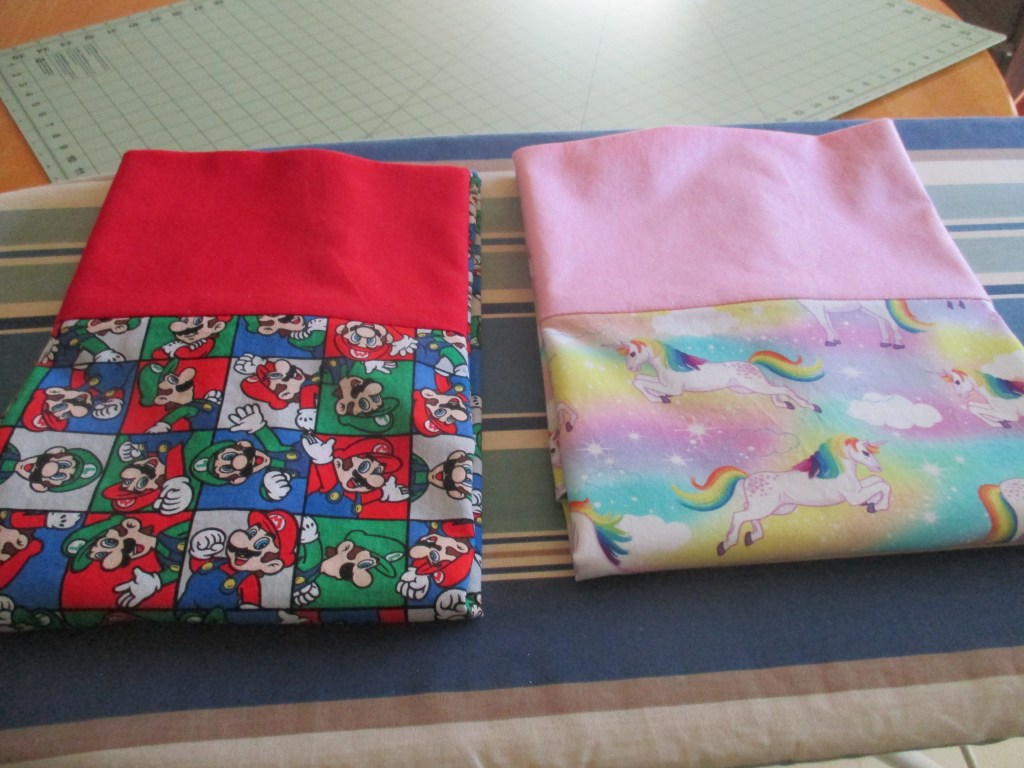 Jackson selected this Mario cart fabric and a solid red trim and Addie, after much deliberation, picked out the pastel unicorn fabric with a pink glitter-infused fabric for trim.