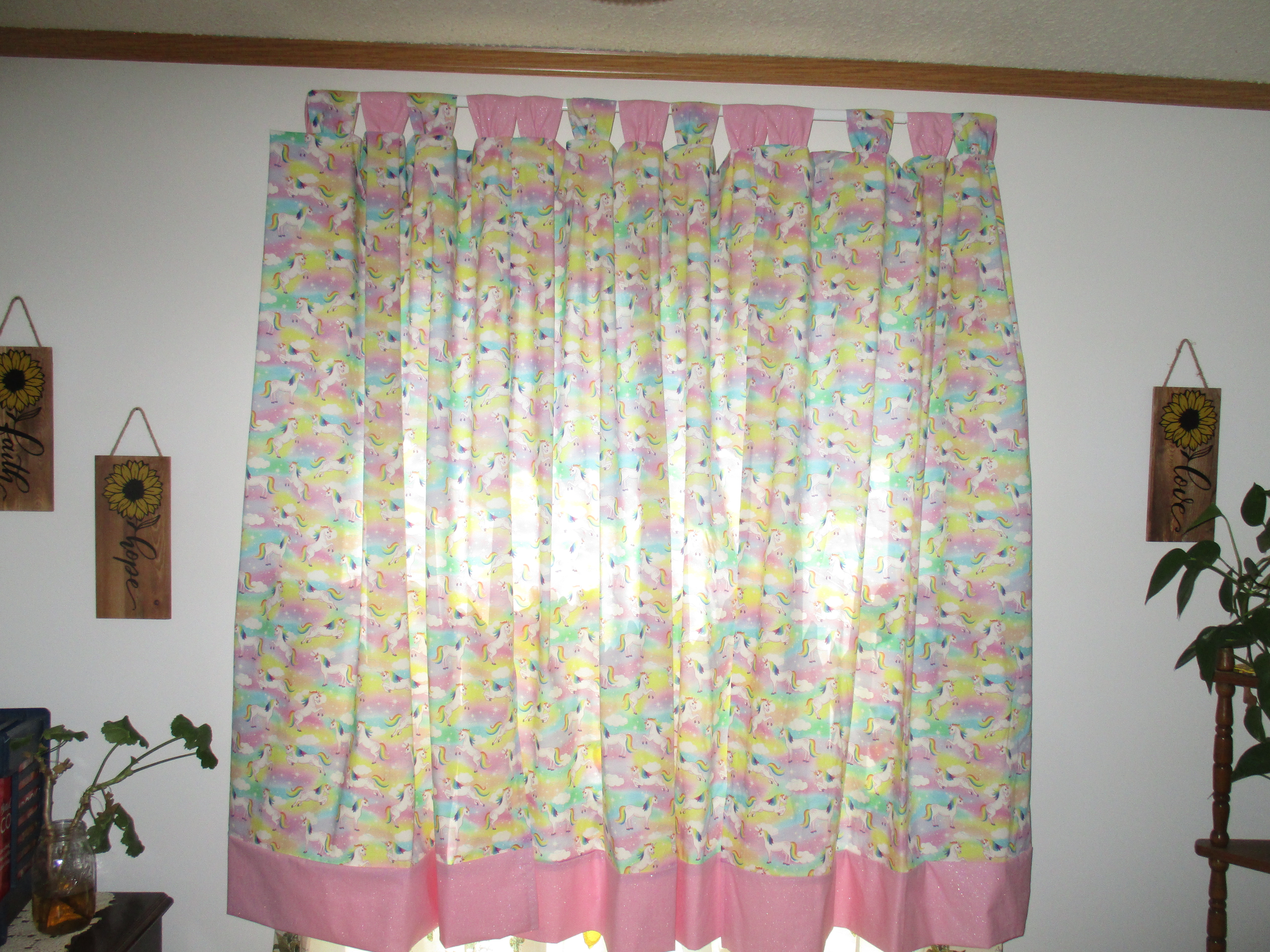In these pictures the curtains are hanging on windows in my home. The windows that they were made for are wider than the ones in the pictures so the top loops will not be so bunched up when the curtains are in their new home.