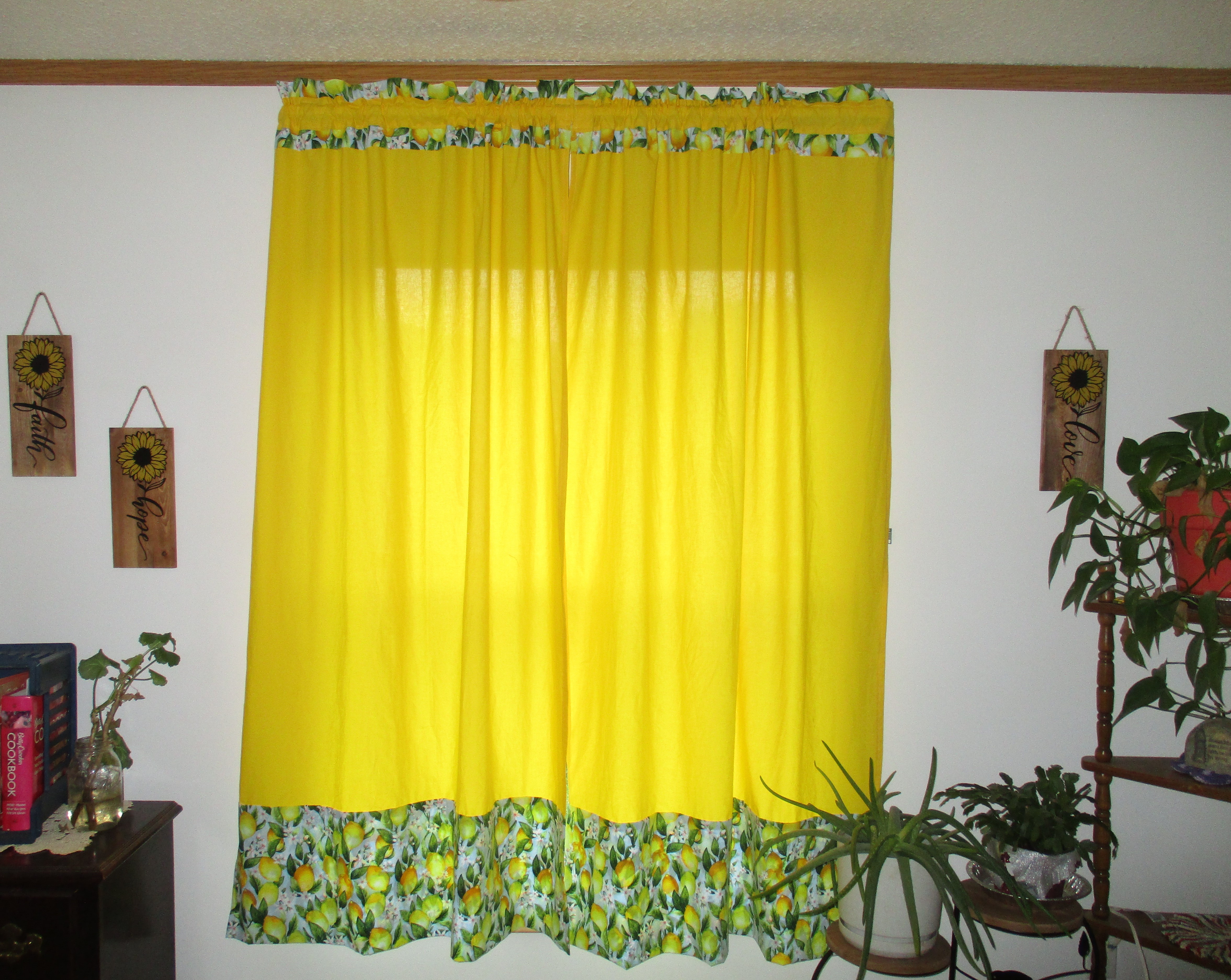 The picture above is the new dining room curtains I made. You may remember the kitchen curtains I made last year are full panels of the blue with the lemon pattern that I used as trim for this set. I am very happy with the way these turned out. They are very cheery and, in the afternoon, when the sun shines through the yellow, the room glows.