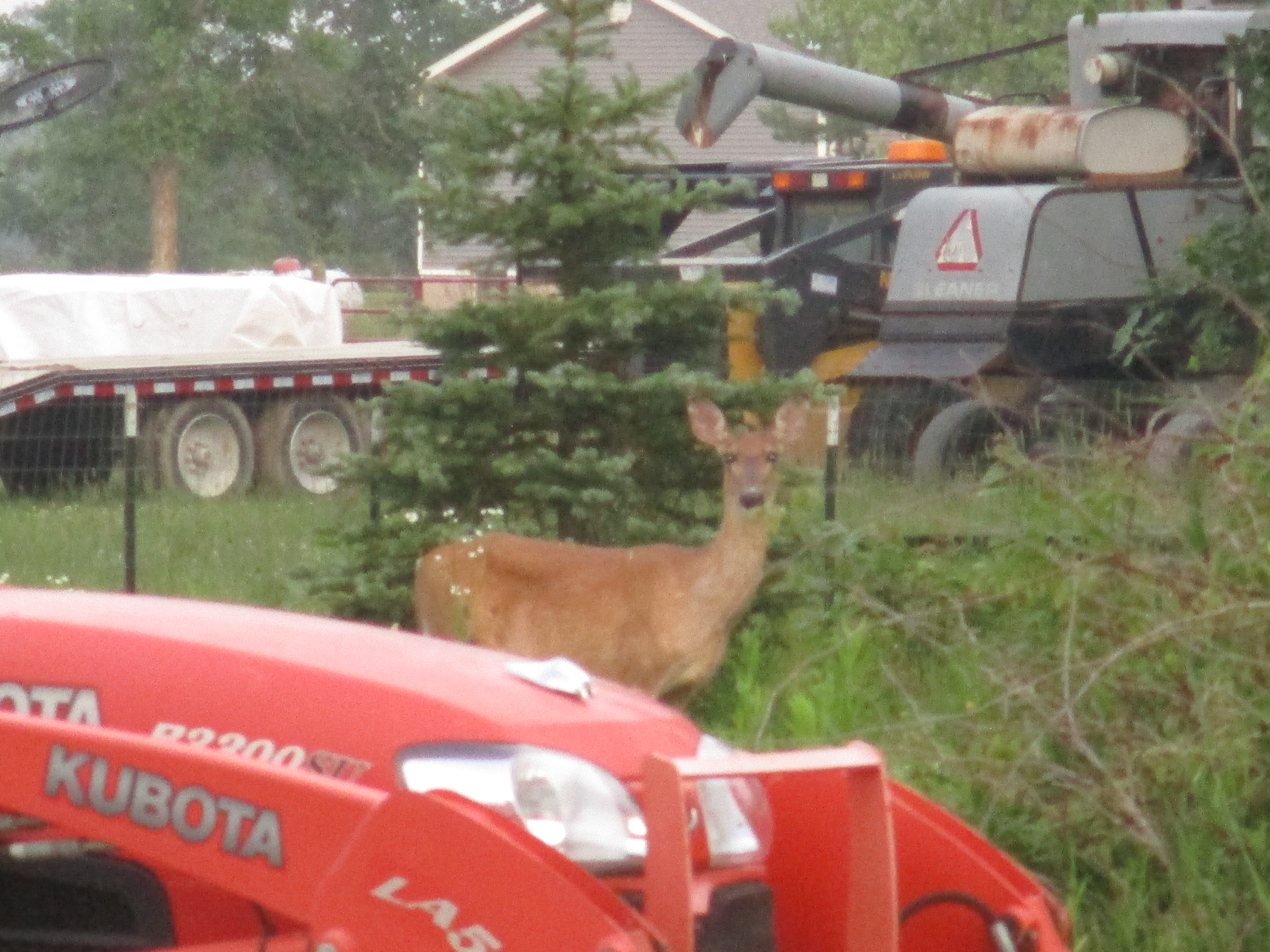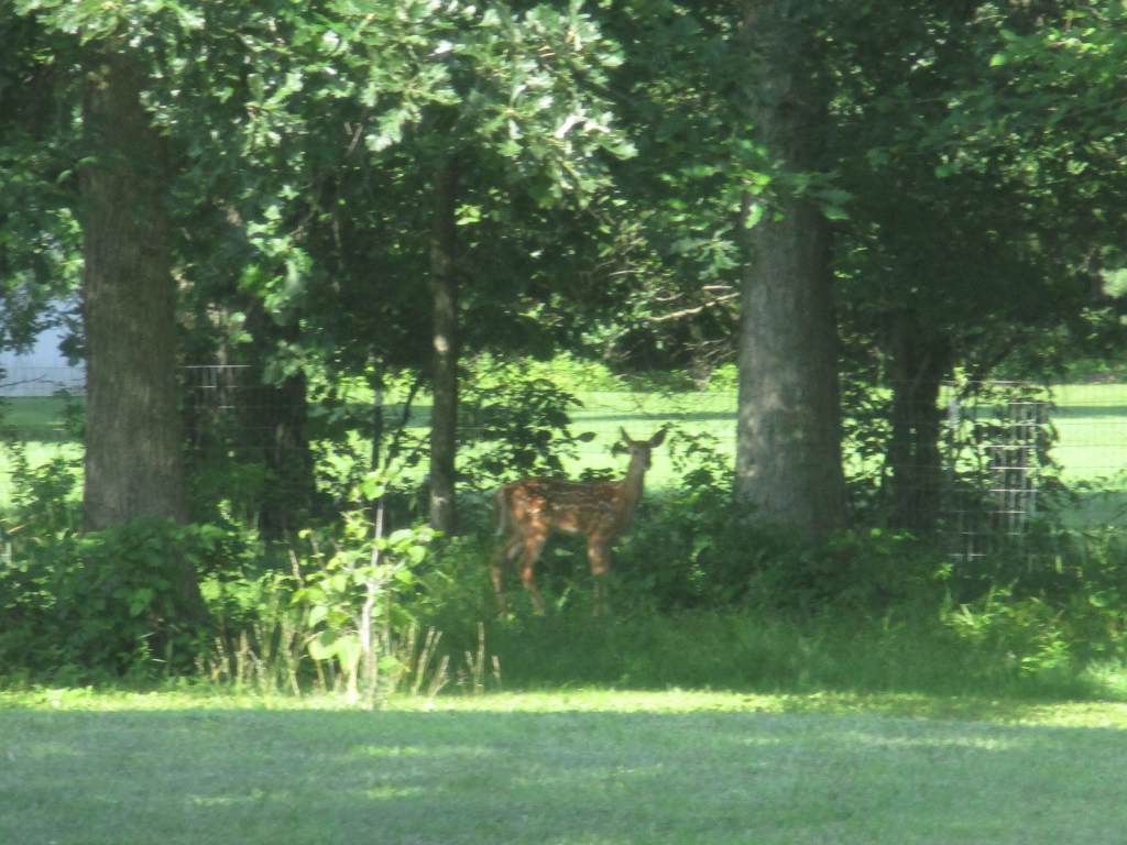 While its mother was on the outside of our fence apparently wanting to get her baby out. I’m not certain how the young one got inside our fence. I don’t think it was born on our property because it looked to be at least several weeks old and I think we would have encountered it before now. I don’t think it jumped over the fence because it didn’t seem to know how to jump back over. In the evenings, when the dogs are not at the farm, we sometimes leave the gate open, so a likely case scenario would be that momma brought the baby in when the gate was open and we unknowingly locked the baby in.