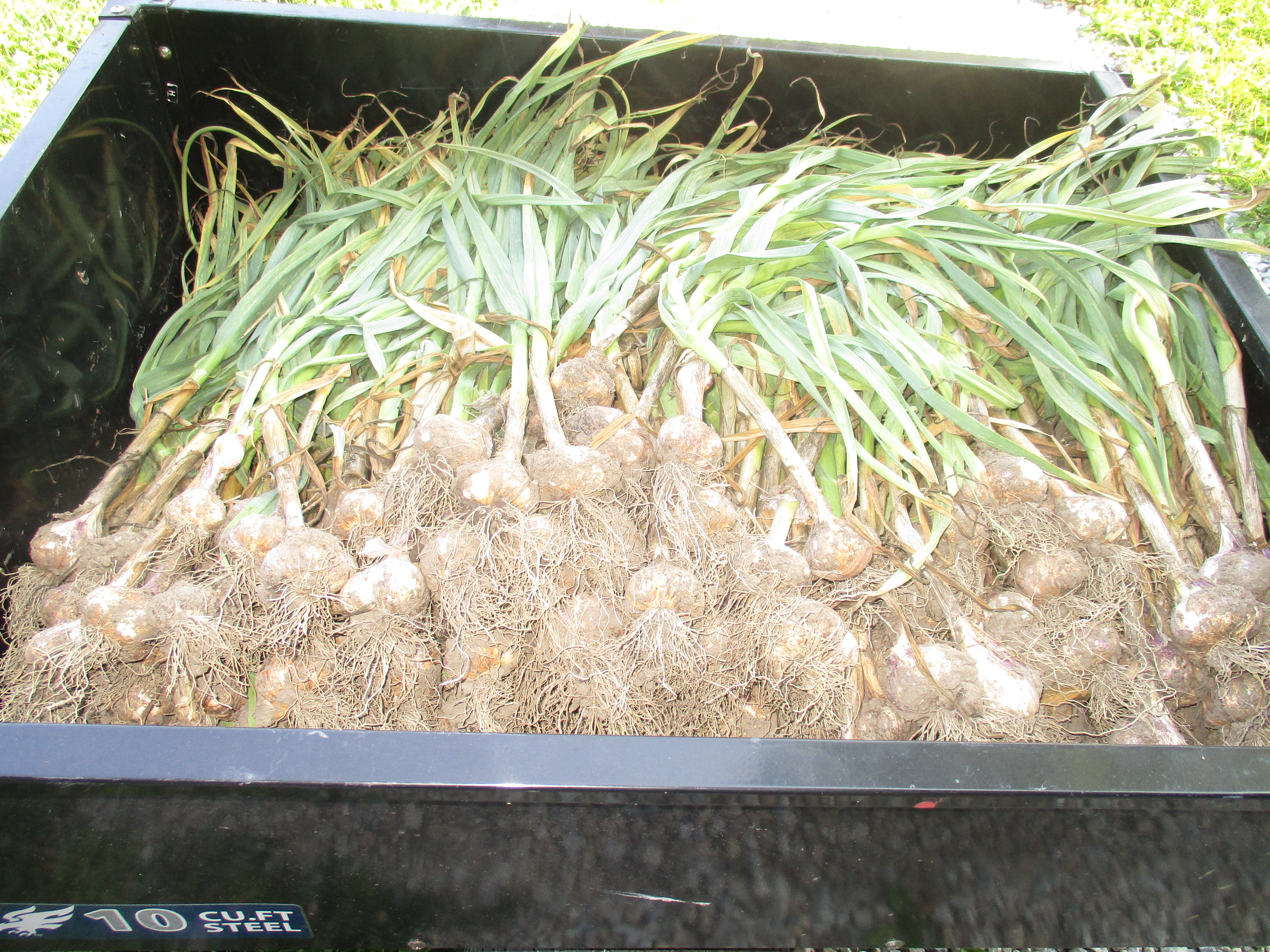 Since heavy rain was in our forecast for Tuesday and Wednesday, we decided Monday was our best opportunity to harvest the garlic. My husband set out Monday morning and in less than two hours had all 330 bulbs dug or pulled out.