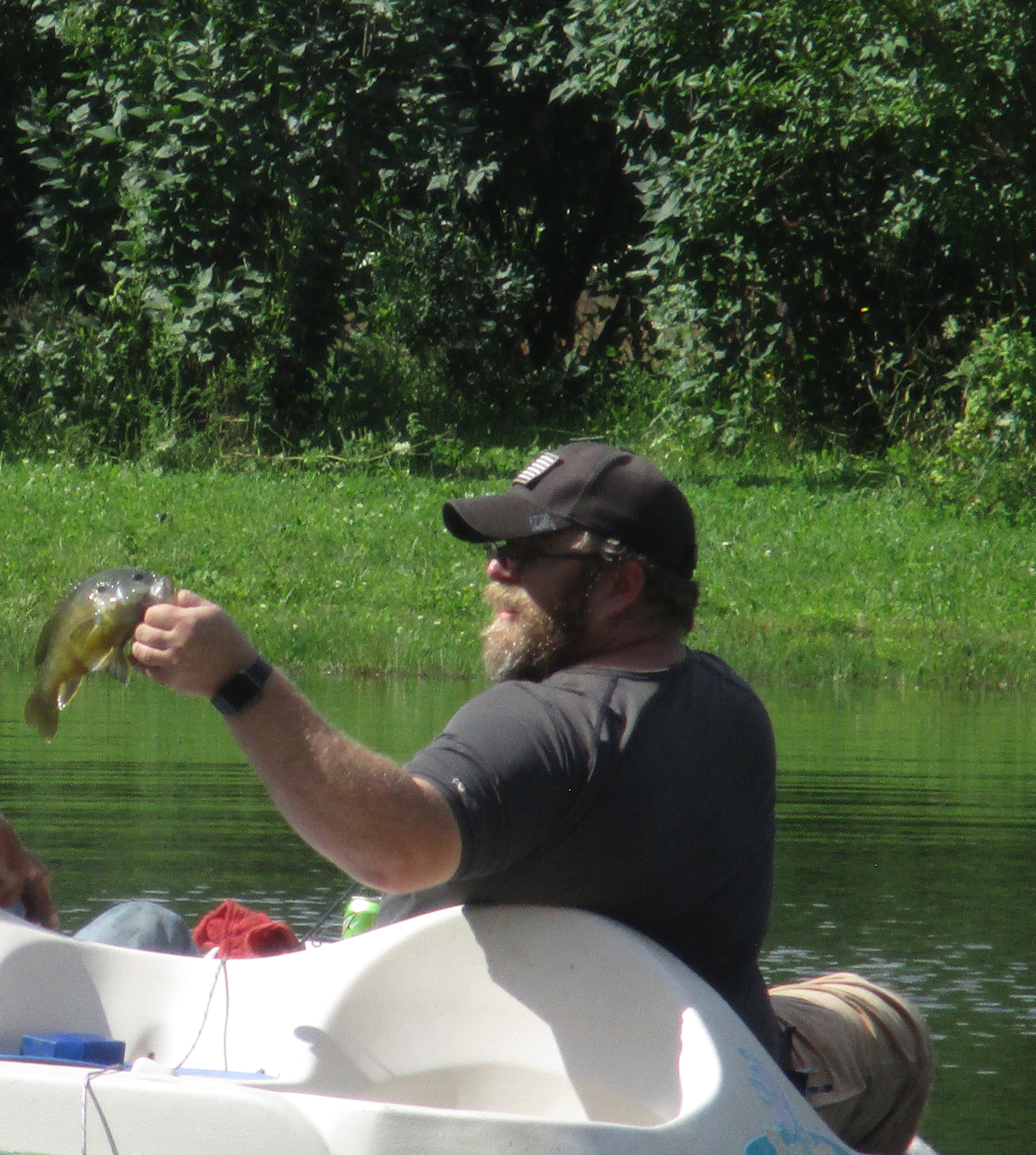 Meanwhile my husband and Ken went fishing. They were reeling in fish one after another. This large blue gill is a mystery fish. How it got in our pond is a mystery as we never put blue gills in there. The rest of the fish they caught were perch (we had stocked the pond with perch in 2013).