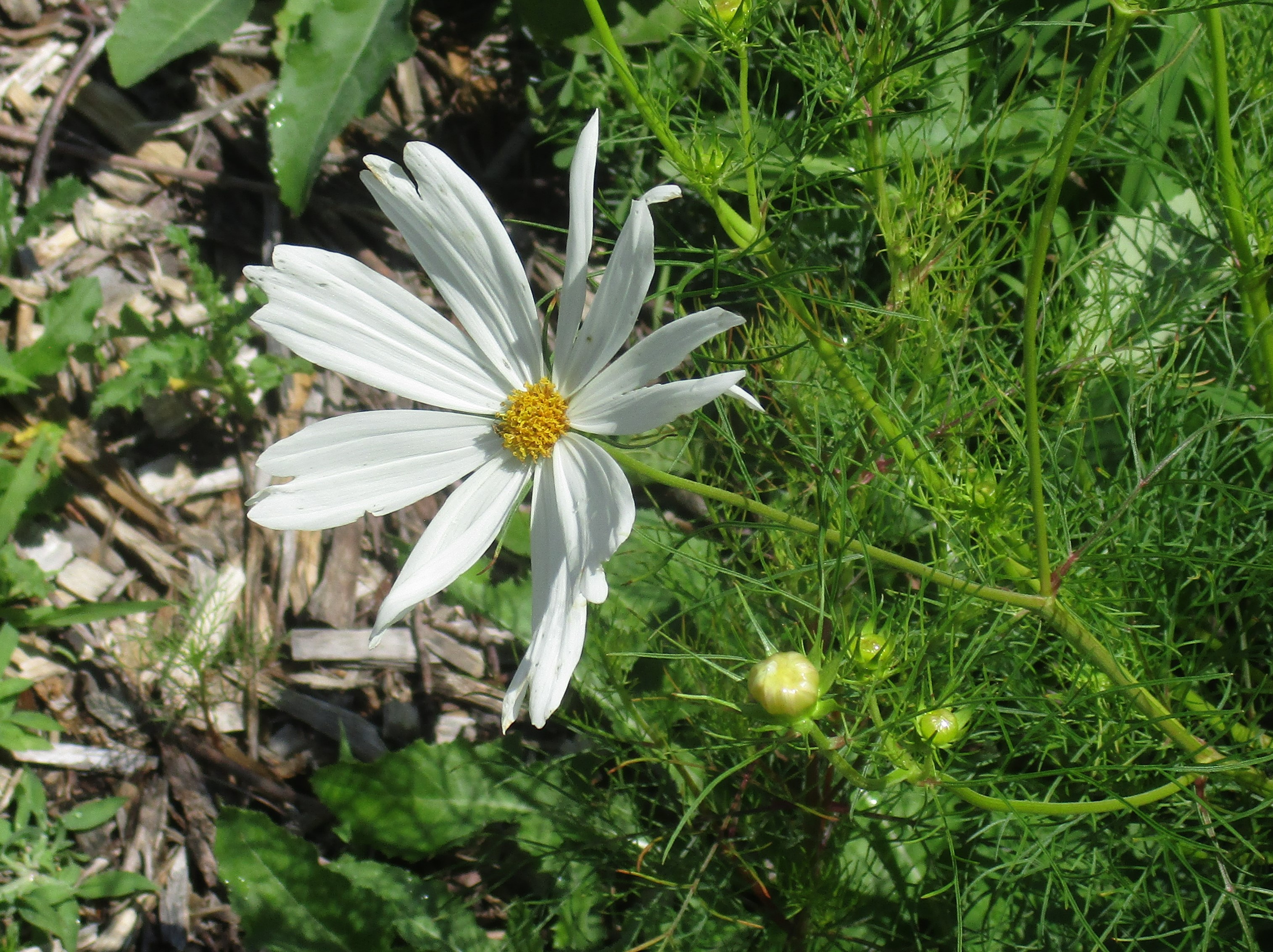 I was surprised to see that this cosmos that came up voluntarily from seeds that were dropped last year is white while all of cosmos last year were all pink. I not sure how to explain that – likely is has something to do with the plant’s genetics. I’m now waiting for others to blossom to see what color they are.