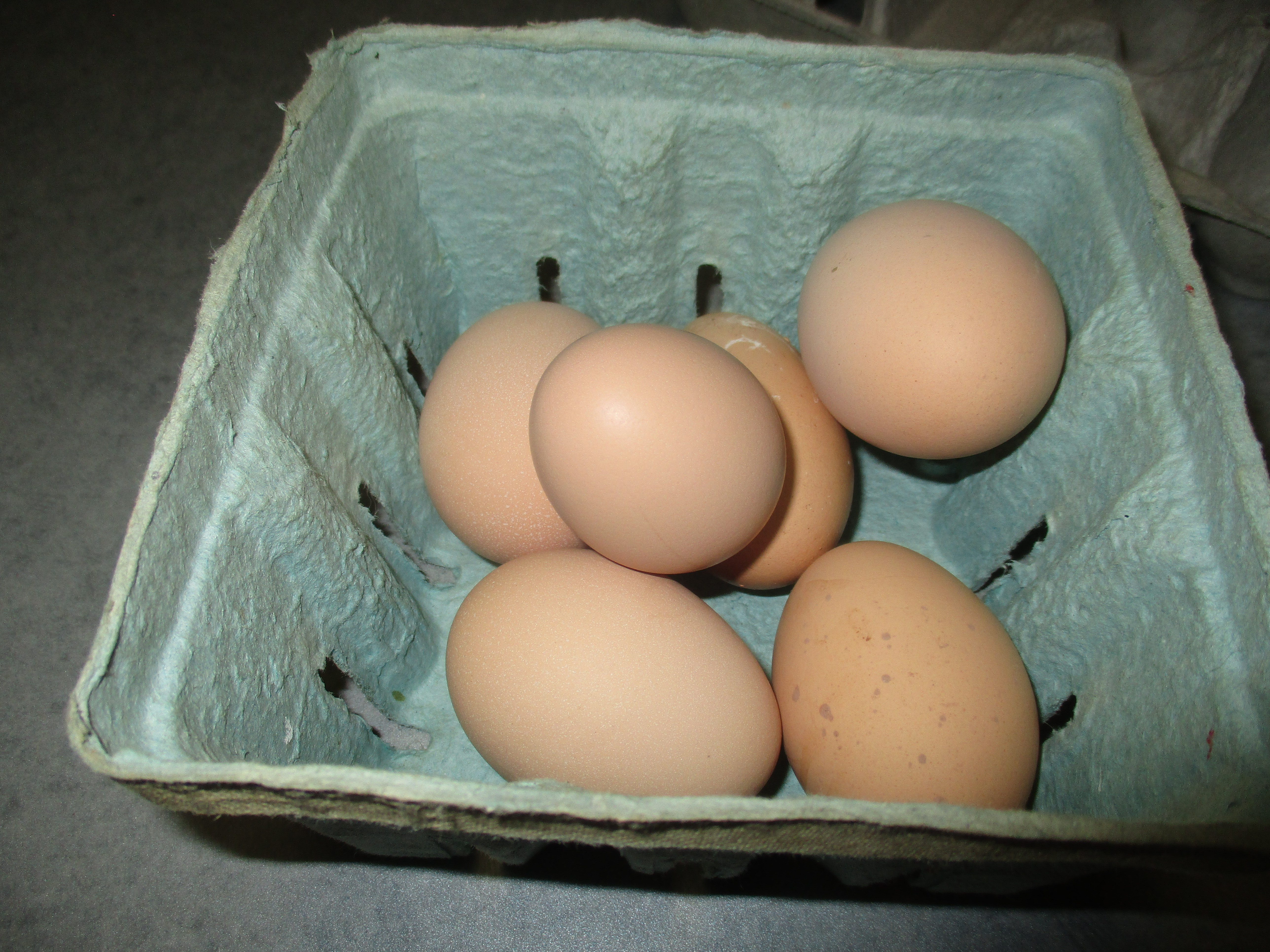 Our young hens (the chicks that arrived back in March) have started laying. They turned 20 weeks old on Monday. On Tuesday my sister called and told me she had found 3 small eggs in her coop that day. Three of the 6 hens we gave her had started laying! Since we hadn’t seen any small eggs, which is evidence that a young hen is laying, I started giving our girls pep talks. “What are you all doing hanging out here? You should be in the coop giving me an egg and earning your keep.” Today my husband found our first small egg. In the photo below the egg in the center is from a young hen. It’s about 1/2 the size of the other eggs.