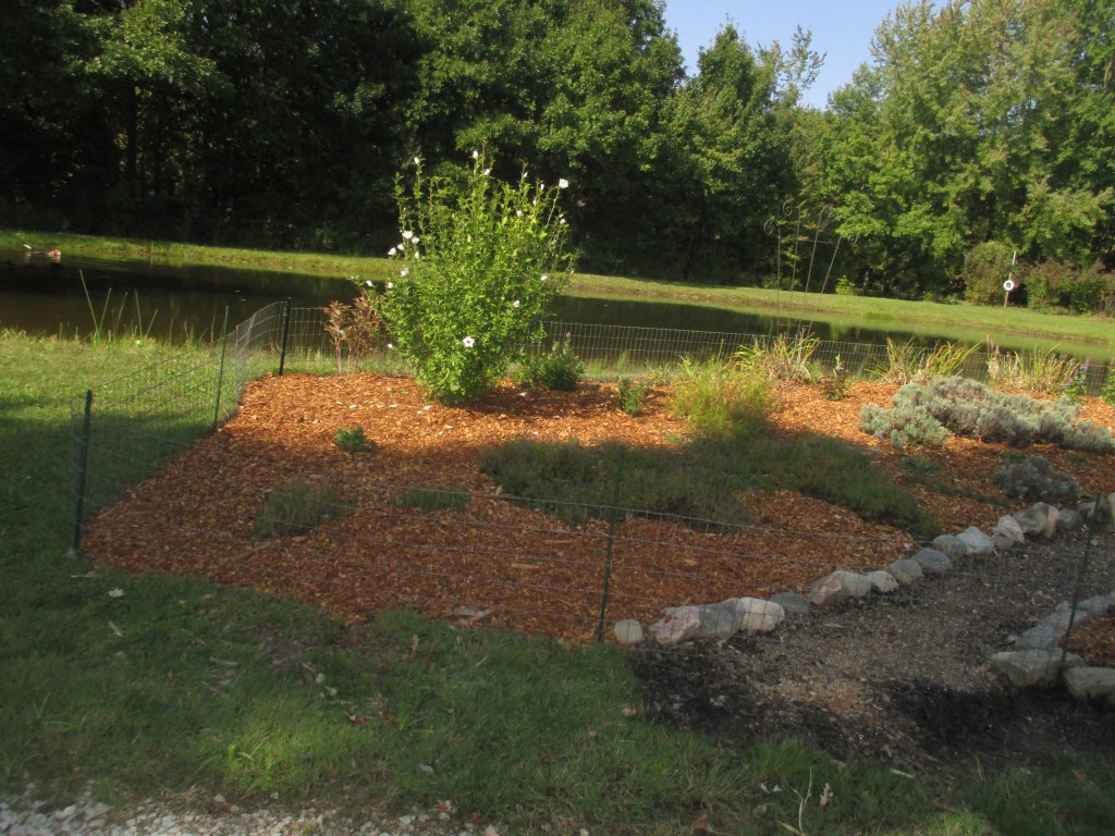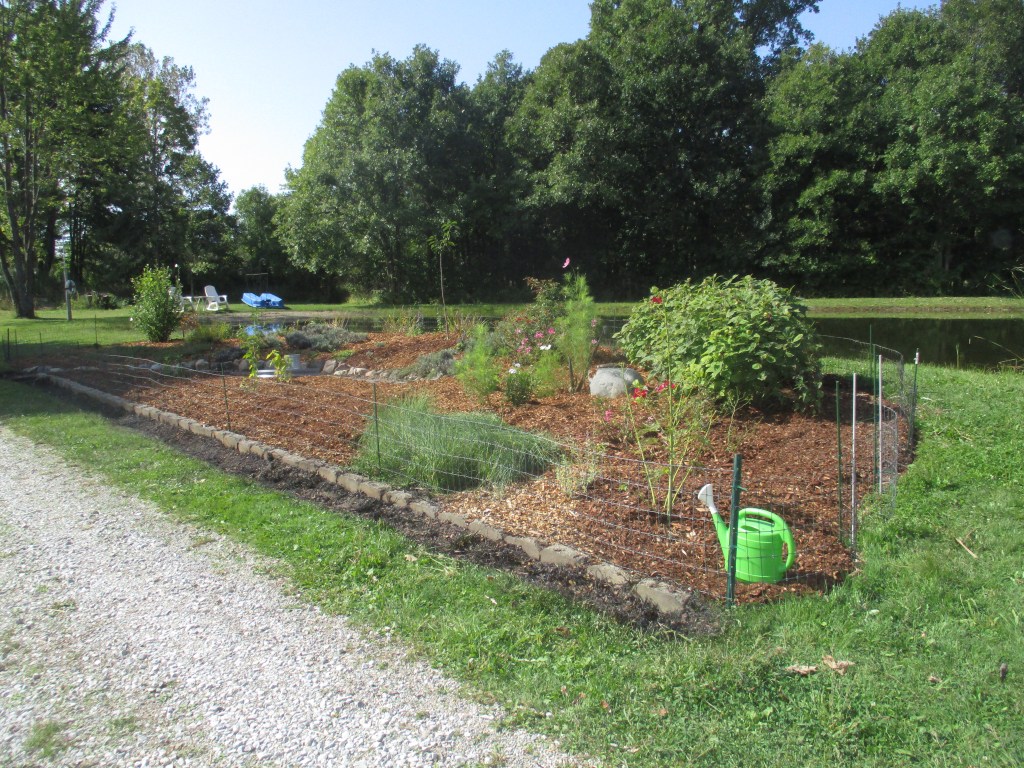 My husband got the fence up, then I began weeding while he edged along the fence. We each worked on it at least a couple of hours most days. He also brought in bucketfuls of mulch with the tractor, that he got from the neighbor, and we spread the mulch after weeding and edging.