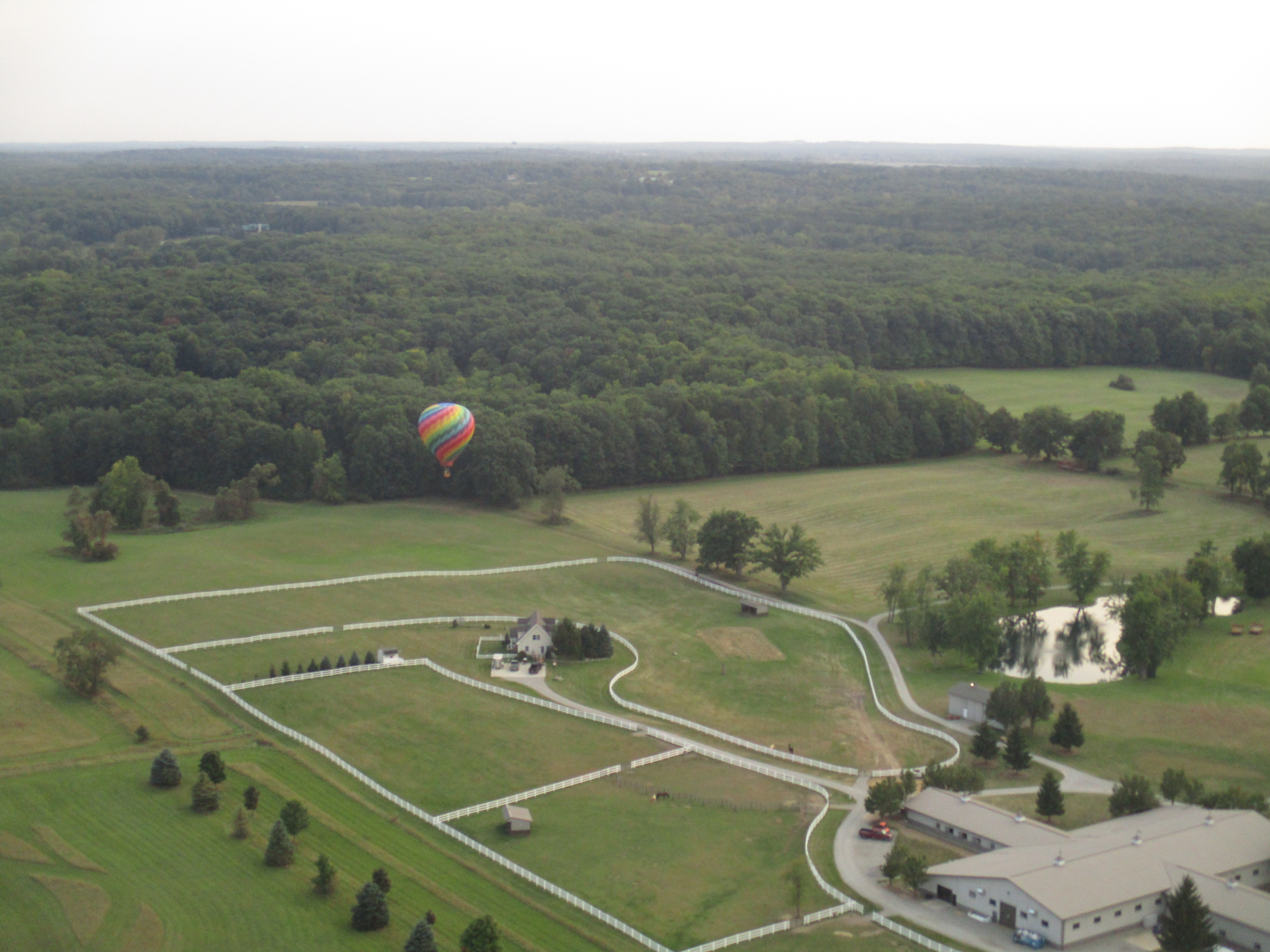 Much of the landscape we flew over was hilly and wooded. there were a lot of small ponds and many horse farms in this area. In the above picture the other balloon is preparing to make their landing. Our pilot told us that some of the homeowners in the area are very friendly toward them and welcome their landings while others do not like them landing on their property. They try to stay away from corrals and horse barns as the horses can be spooked by the balloons. They don’t know all the property owners in the area so sometimes they just have to land and take a chance.