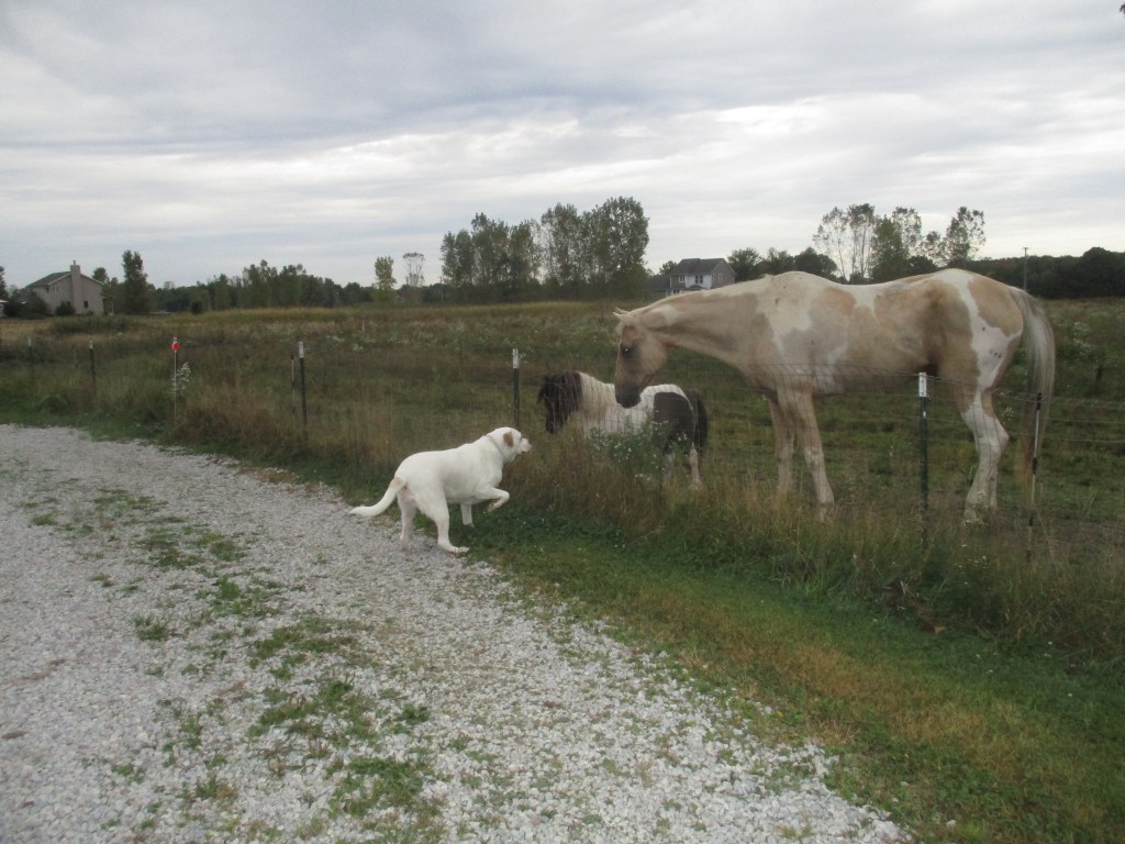 She was curious about the horses. She acted like she wanted to play with Bernard (the miniature) but she backed away when Colby Jack got close. I think he was a bit intimidating.
