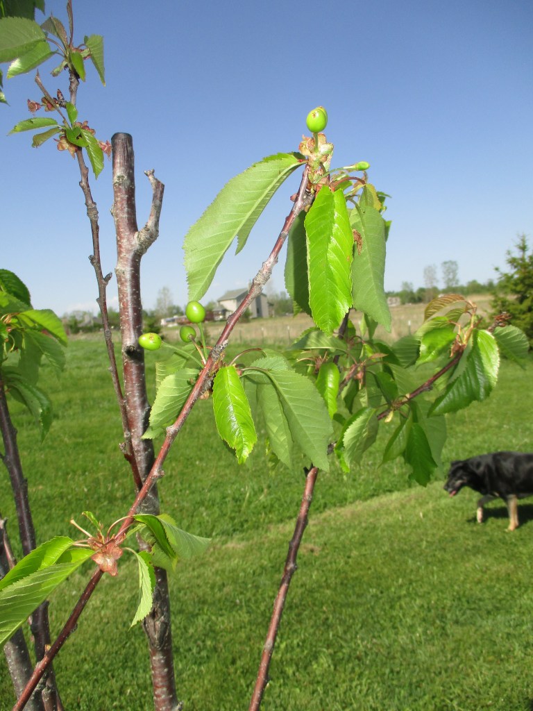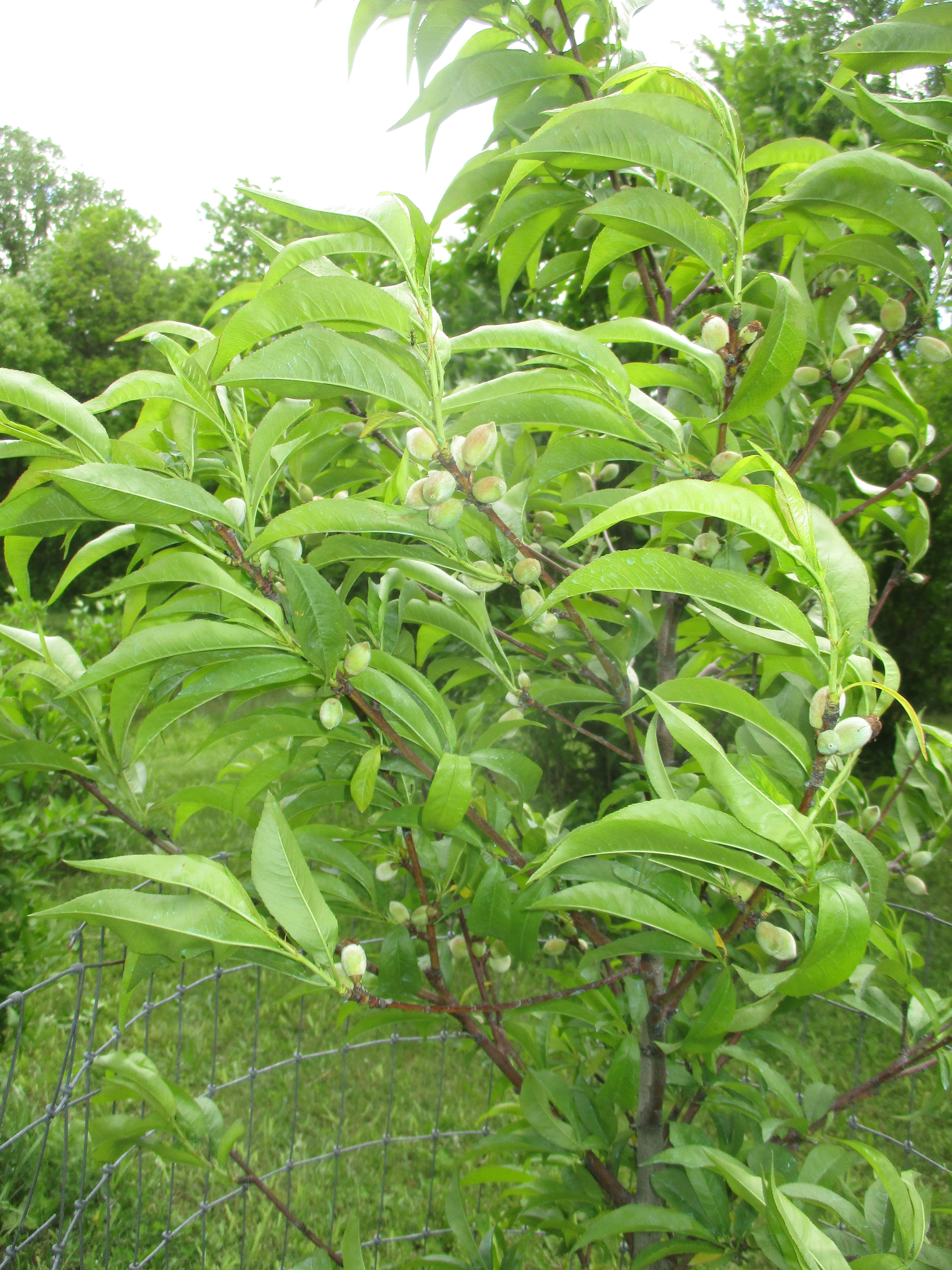 The peach trees have many small peaches. too many for this young tree to support. I read that the fruit should be thinned, leaving only one peach every 6 to 8 inches. This will be done soon.