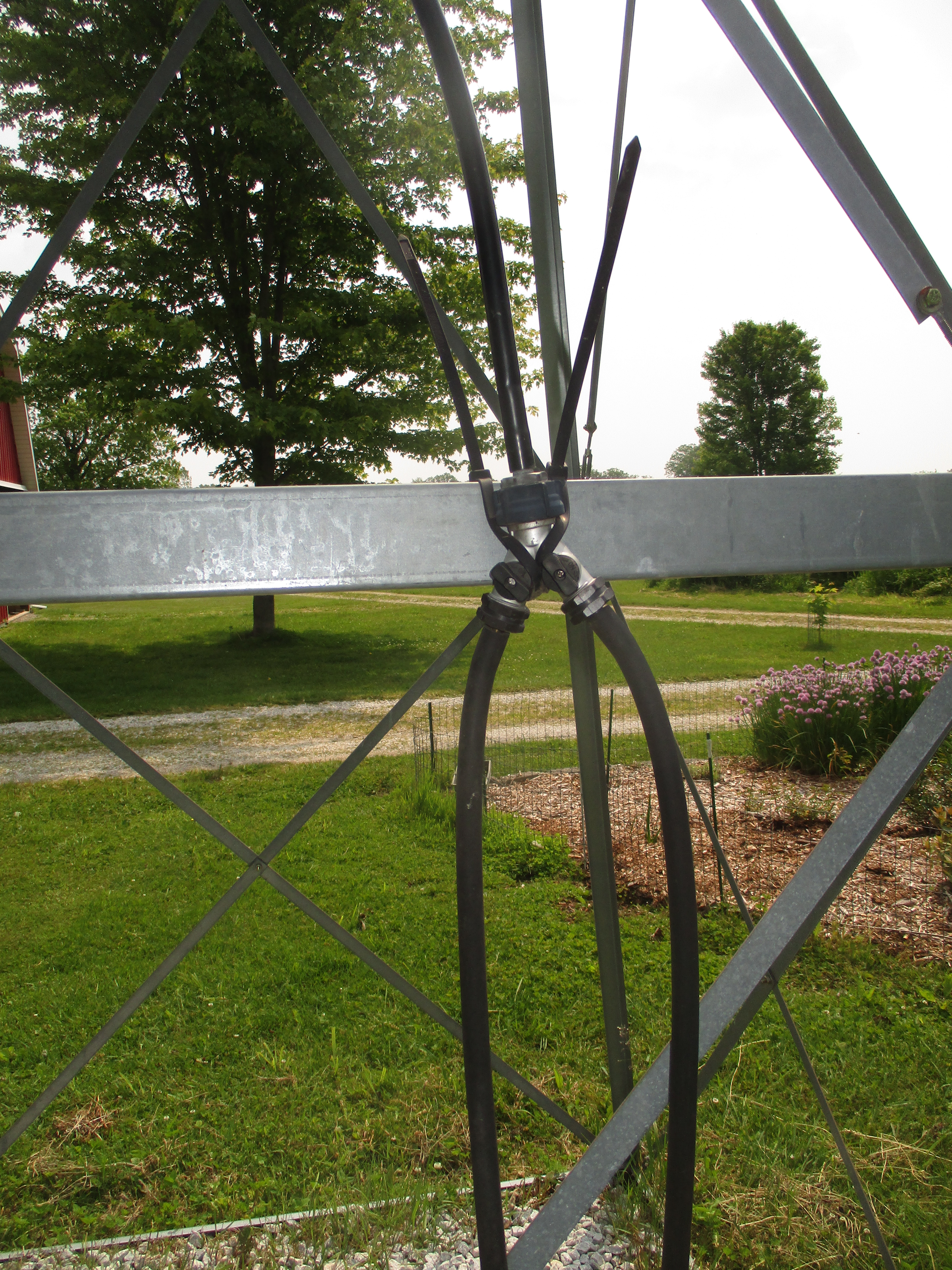 In the above photo the hoses attached to the windmill run down into the pond where they are attached to porous devices called stones. We have two stones located in different areas of the pond. When the wind makes the windmill turn, air is pumped through the hoses and comes out the stones and into the water, thus providing much needed oxygen.