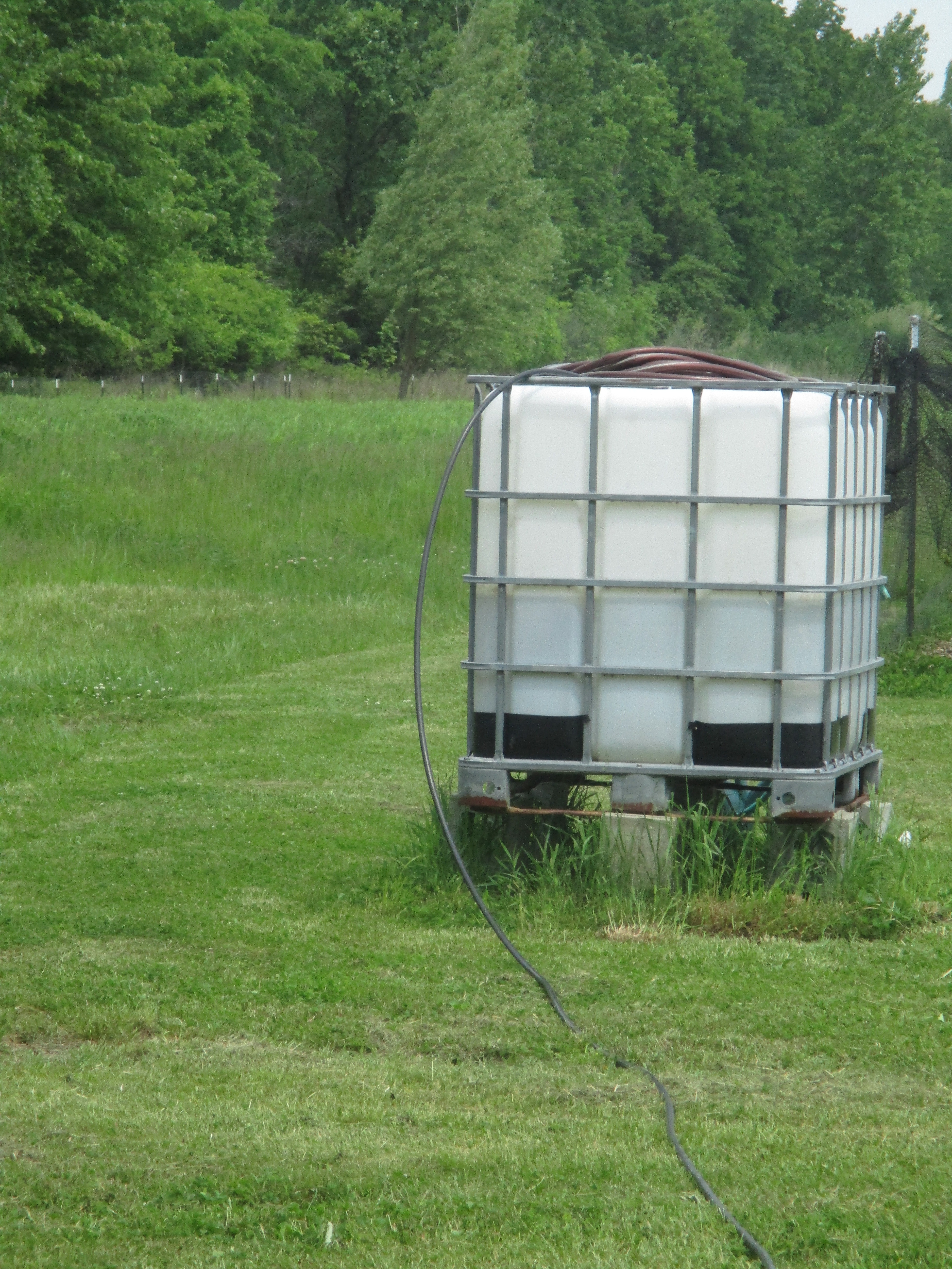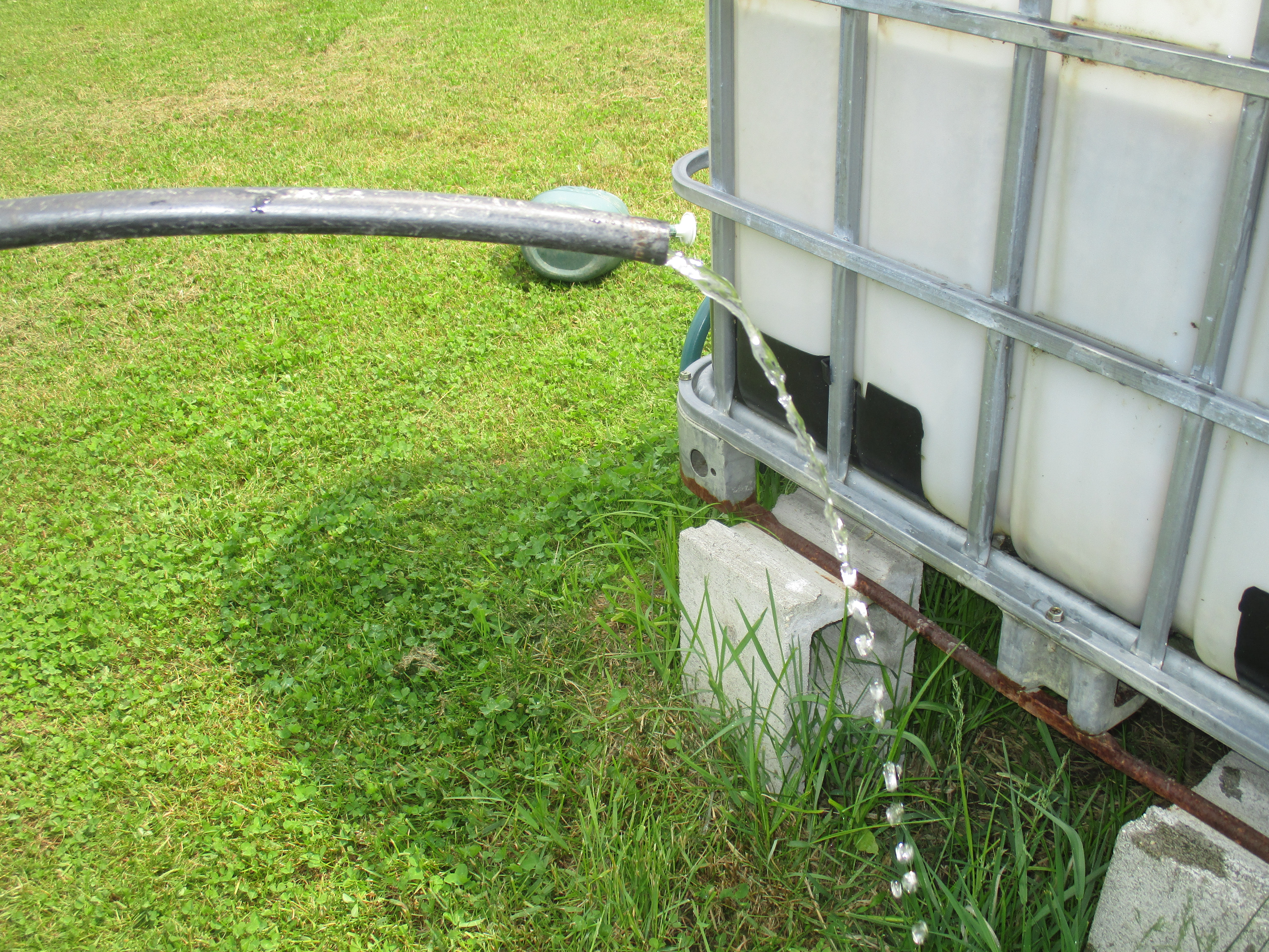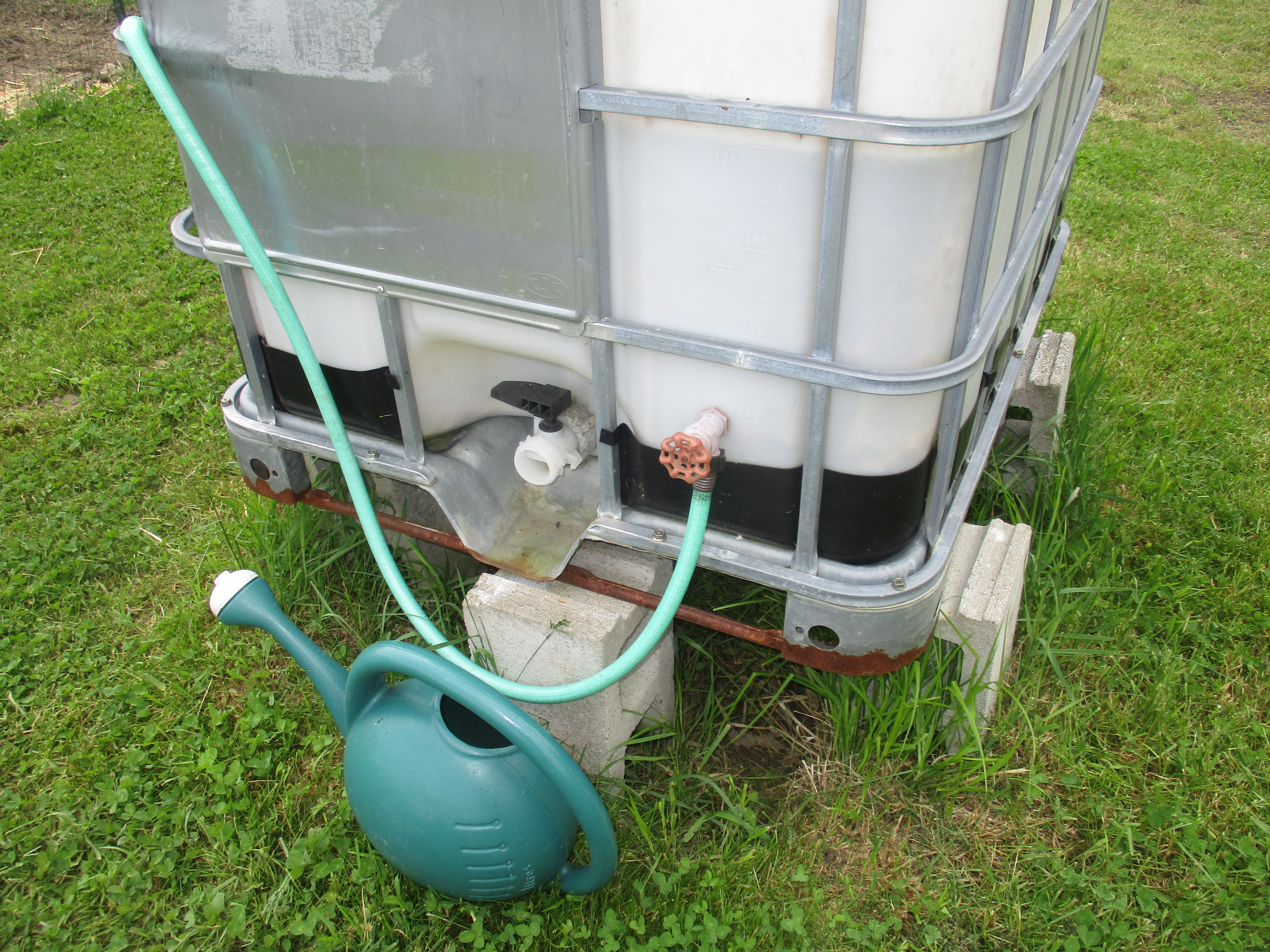 My husband installed spigots near the bottom of the tanks so we can attach a garden hose. We can use the garden hose to fill watering cans or sometimes we water plants directly from the hose.