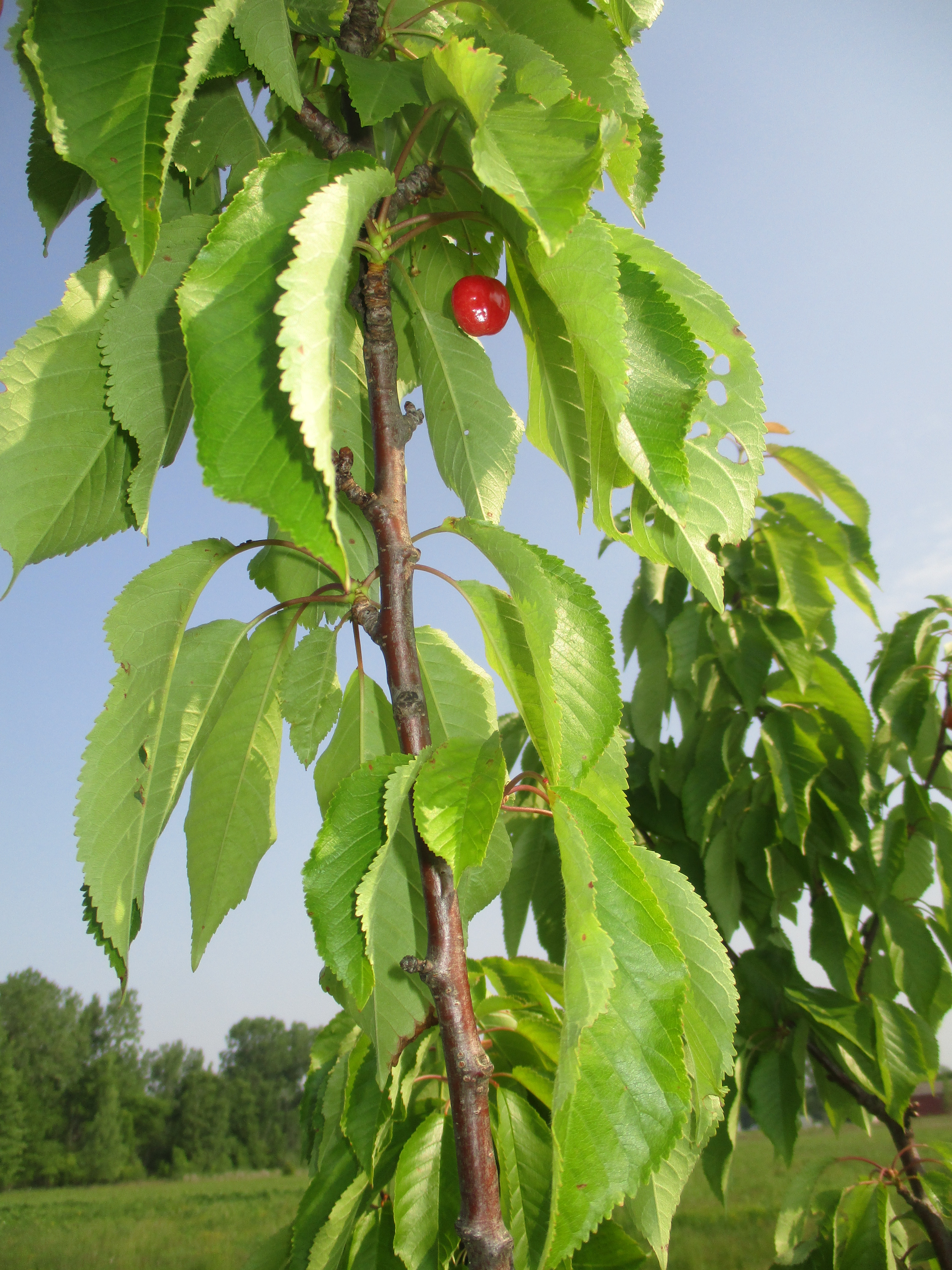 Ripe cherries on one of our new trees. I harvest three wonderful, sweet cherries from this tree. Hoping for a bigger harvest next year.