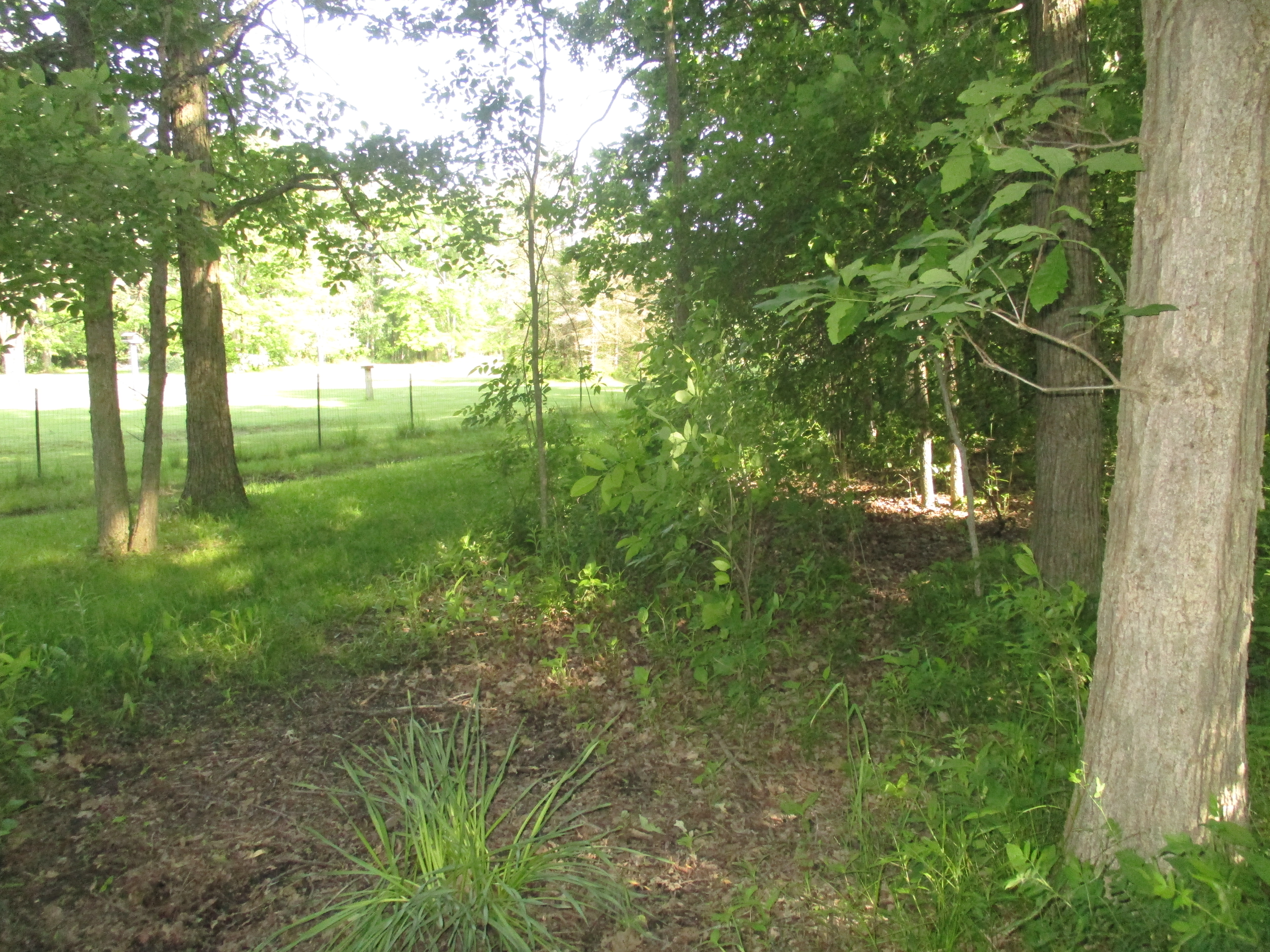 Beyond the woods the sun shines on the neighbor’s yard.