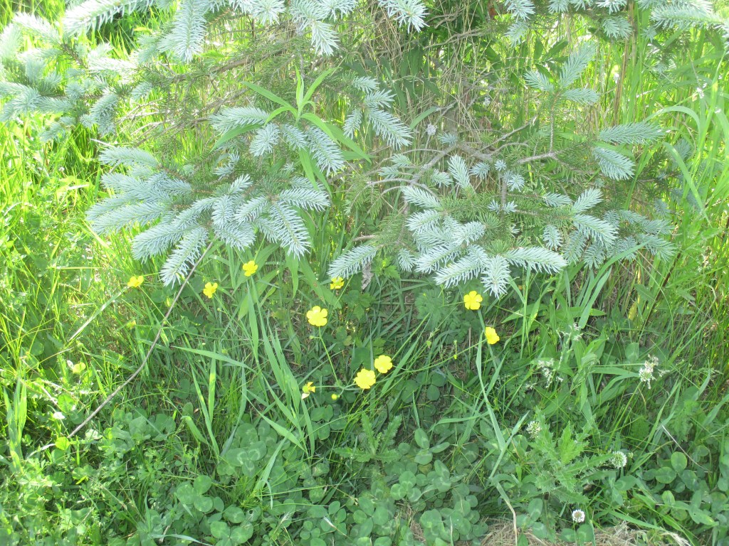 Butter cups under the spruce tree.