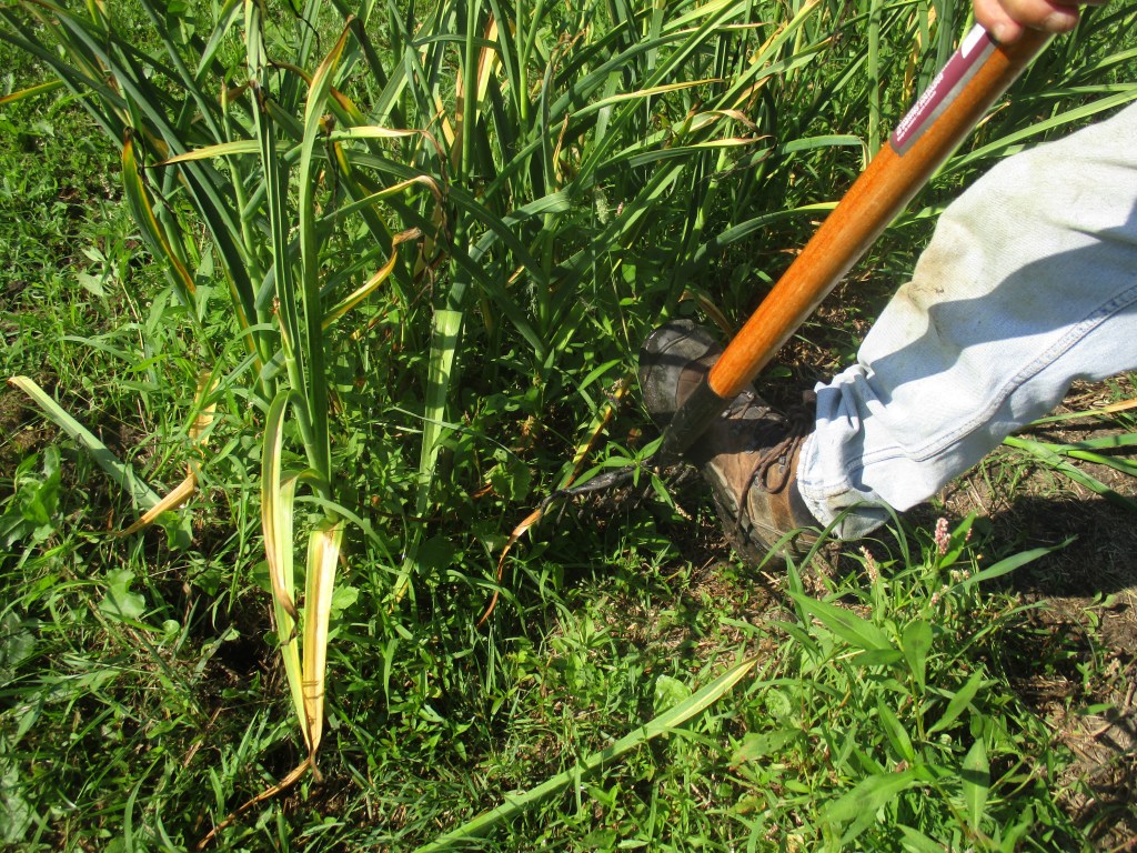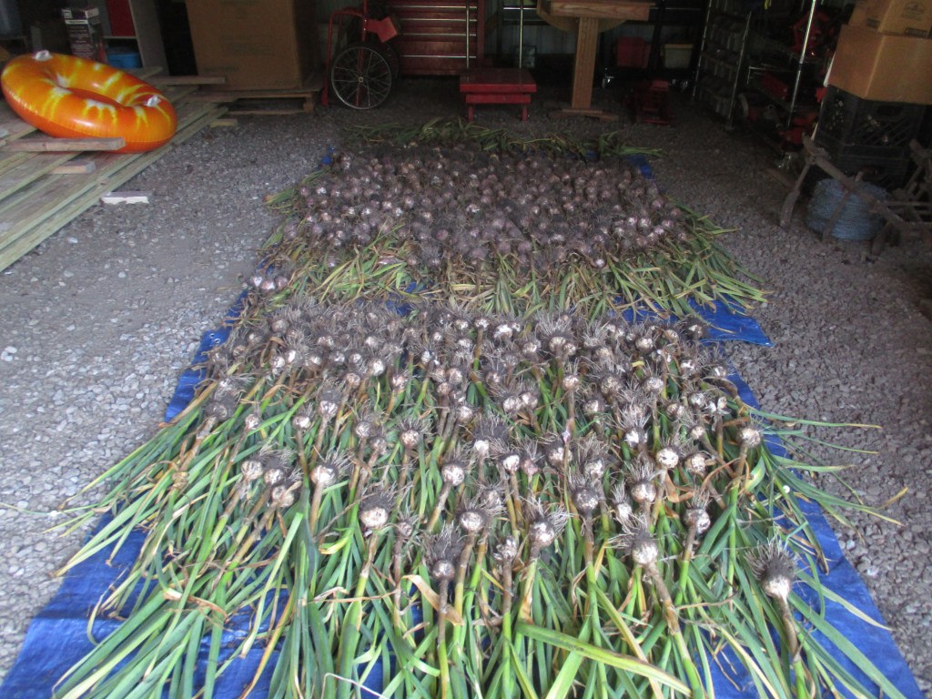 I had some chores that needed to be done at the house last Monday (July 14) morning, while my husband went to the farm to begin harvesting the garlic. I told him if he wanted to wait until the next morning, I would be able to work with him, but he insisted on starting that morning. After 2+ hours he had one variety (310 bulbs) dug and spread on a tarp in the barn before breaking for lunch.