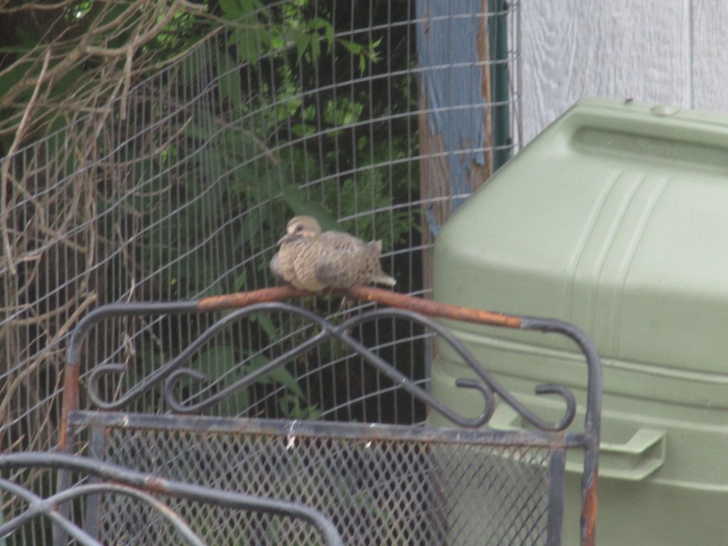 Yesterday, I couldn’t see baby and there were no parents around, so I was relieved this morning when my husband came in and told me that the baby mourning dove was on our deck. By the time I grabbed my camera and got out there it was gone. 😦