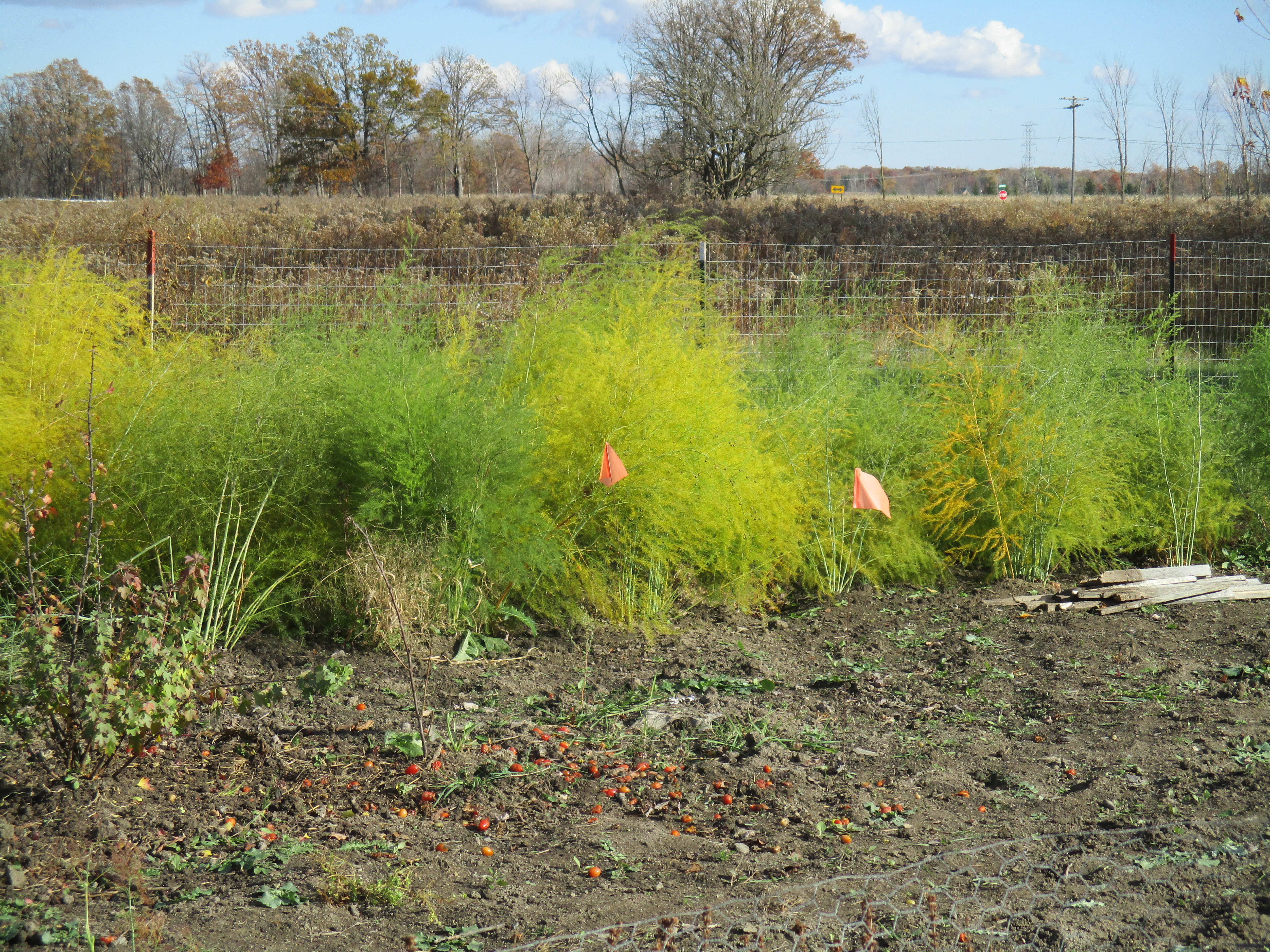 In the above photo, taken last week, the green and yellow feathery looking plants are asparagus. Yesterday I cut them all down since most of the top growth has died off, turning yellow or brown. As I did this I also pulled any weeds that were starting to grow up around the plant. It was a great day for playin’ in the dirt.