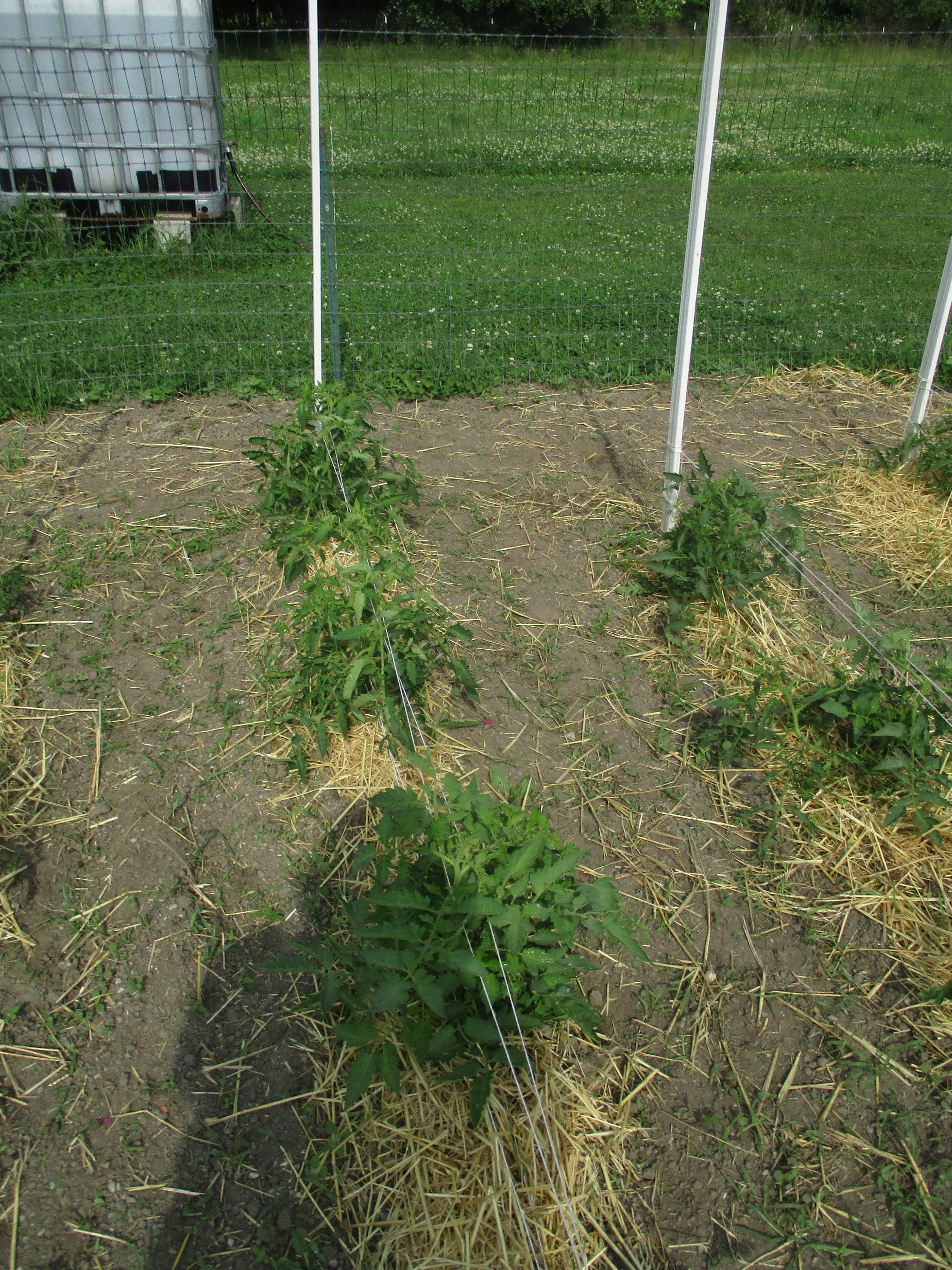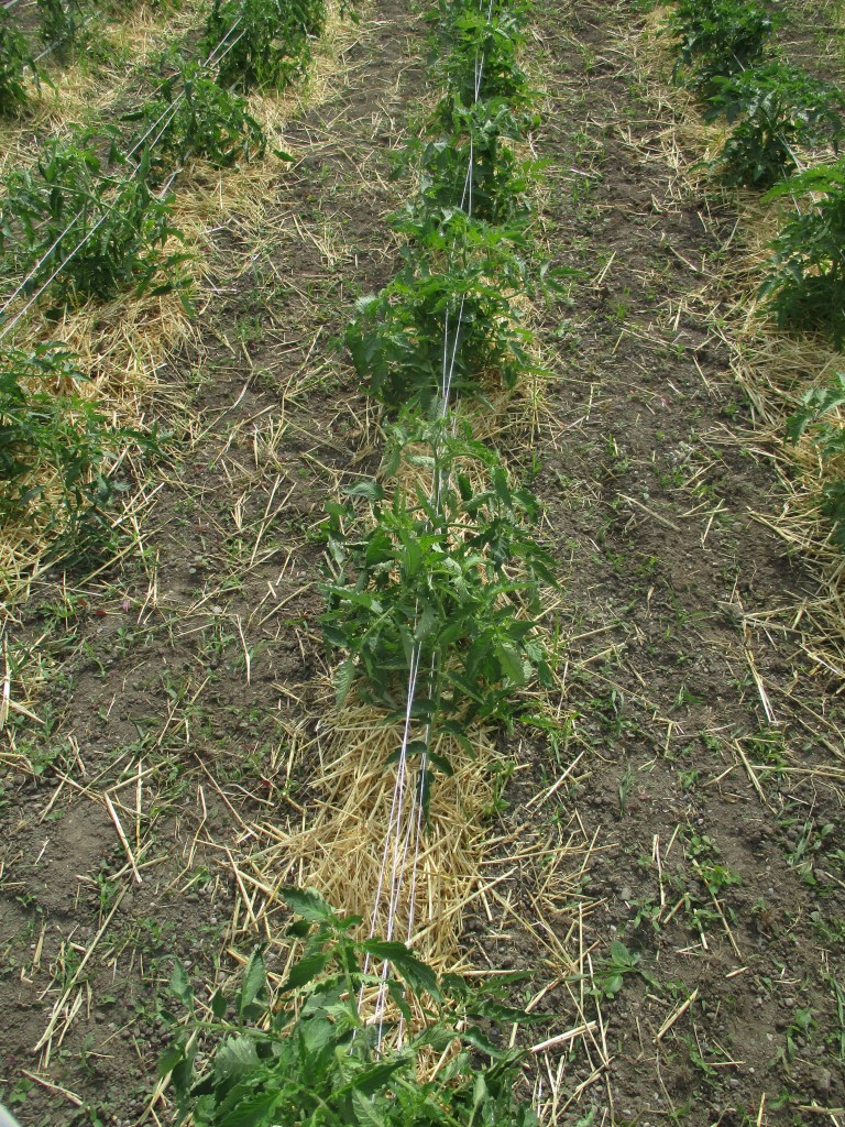 With heavy storms in the forecast for Wednesday afternoon we wanted to make sure the tomato plants were supported. Last year my husband discovered a method called tomato weaving. No more cages or staking each tomato to keep them upright.