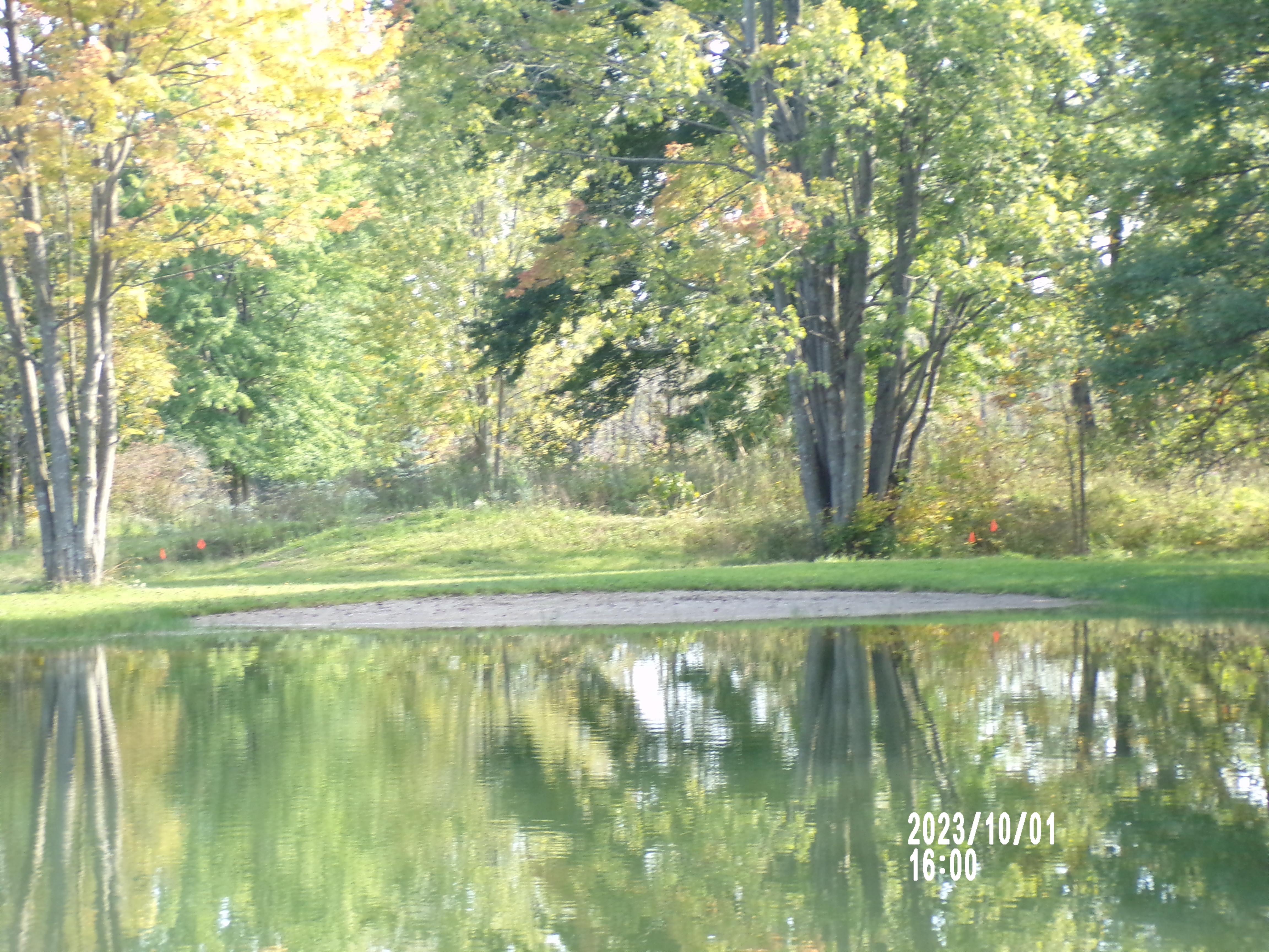 The above picture was taken from the opposite end of the pond. I zoomed in to try to capture the 4 orange flags marking the footprint of the house. If you look really close, you might be able to make them out. There are two just to the right of the maple tree on the left and two more to the right of the maple that is to the right.
